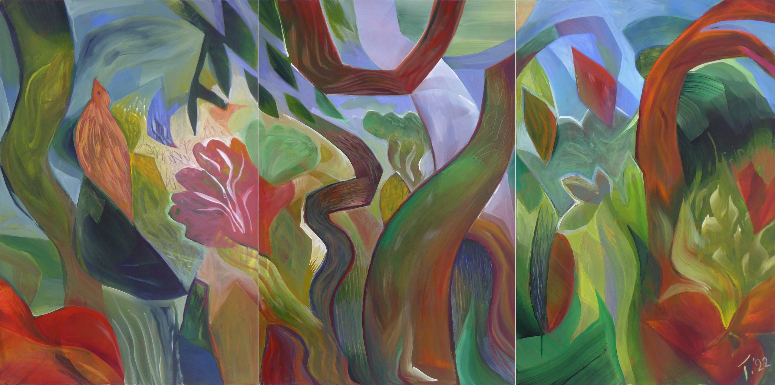 In ‘The Stormbird’, I conjure a mythic landscape alive with organic vitality and elemental motion. Twisting trees, fiery blooms, and spectral forms suggest a world in the throes of transformation, animated by the unseen forces of nature. Across three interlinked panels, color and gesture dissolve the boundaries between earth and sky, growth and decay, inviting viewers into an immersive meditation on resilience, upheaval, and regeneration. Deep greens, lush crimsons, spectral blues, and flame-like oranges create an immersive and almost synesthetic field. Color does not merely describe form but becomes form — it is a kind of living tissue that binds earth, foliage, spirit, and sky. The Koel itself — abstract yet palpable — appears as a harbinger of change, evoking ancient myths of renewal and environmental cycles.