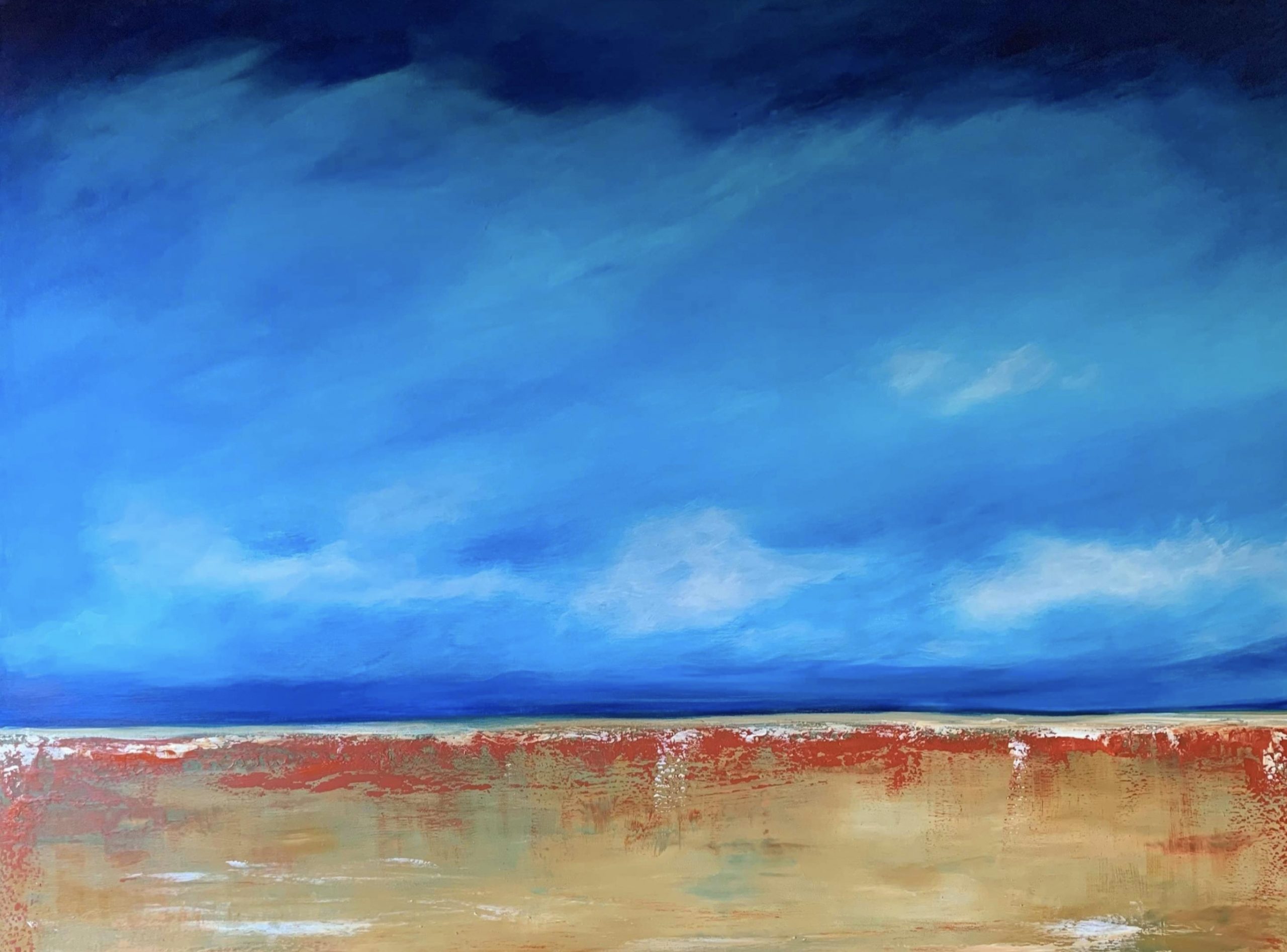This painting began with ominous thunder clouds over a field of flowers but as it progressed I felt an urgency to change the mood from one of darkness to light. ‘The land of plenty’ is painted on a ready to hand stretched canvas in acrylic hues of phthalo blue, red gold, yellow ochre and titanium white and it is intended to bring light and happiness into your home.