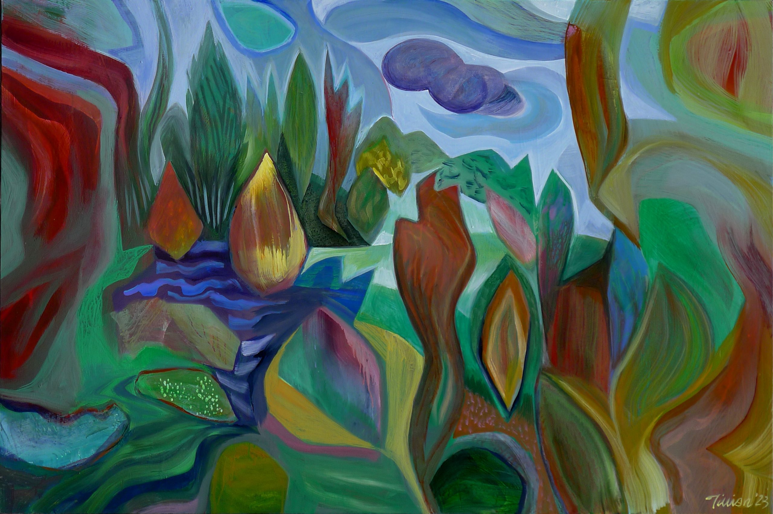 ‘The Last Drop’ is a painting of haunting vitality and quiet spiritual gravitas. In it, I offer a landscape at once richly sensuous and existentially pared back — a terrain imagined at the edge of endings, where natural forms drift between figuration and abstraction, and where elemental archetypes re-emerge in freshly transfigured skins. A central teardrop or seed-form — luminescent, yolk-like, and tender — floats in a violet-hued pool, surrounded by forms that resemble both trees and flames. They seem to lean, dance, weep, and pray. The sky, shaped in lyrical ribbons of blue and grey, is active and sentient. The land below pulses with inner colouration and shifting thresholds, suggesting a world in which matter and spirit are no longer distinguishable.