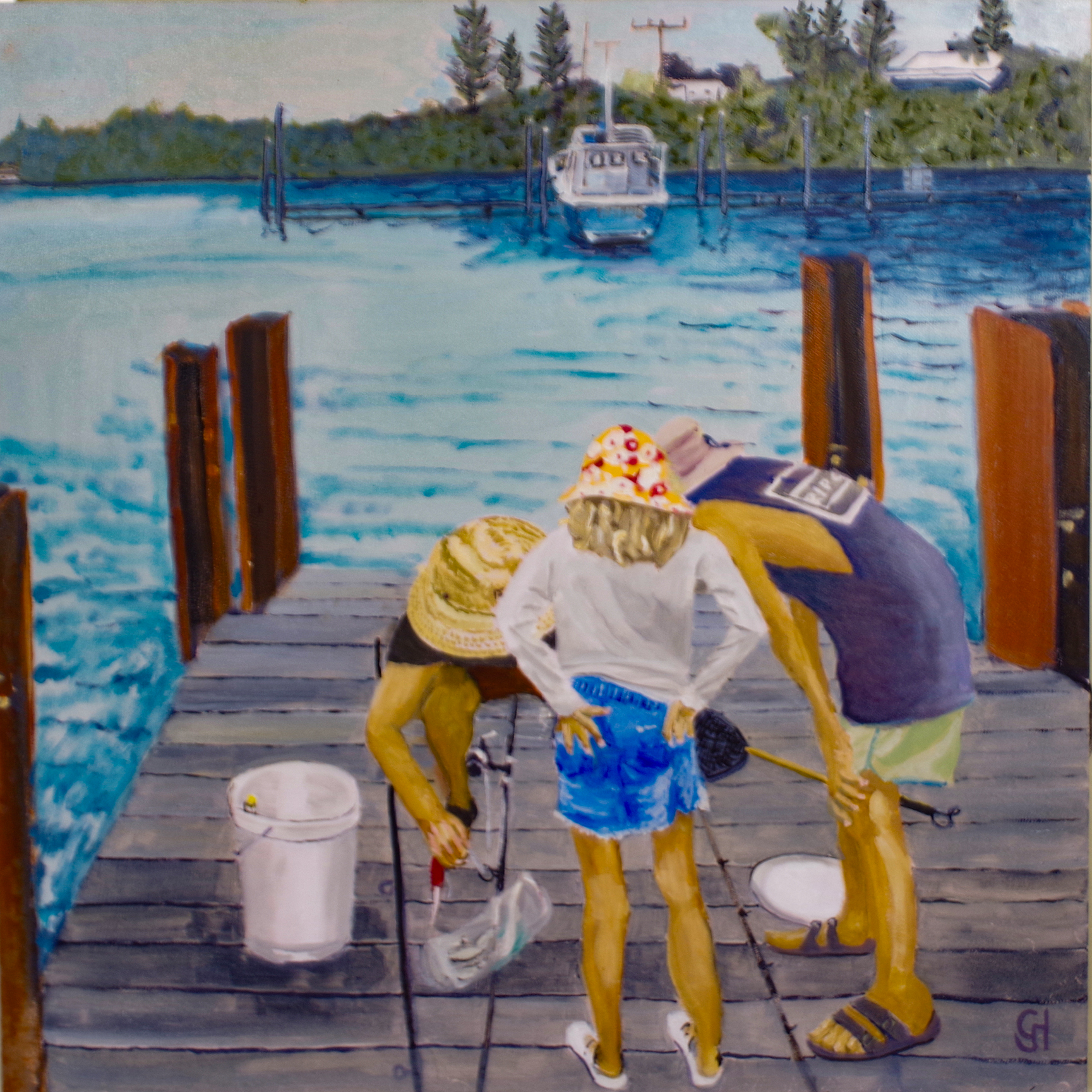 Original oil painting of a view from the wharf on the Wooli River, a young family about to fish, the father is teaching his children how top rig a line.