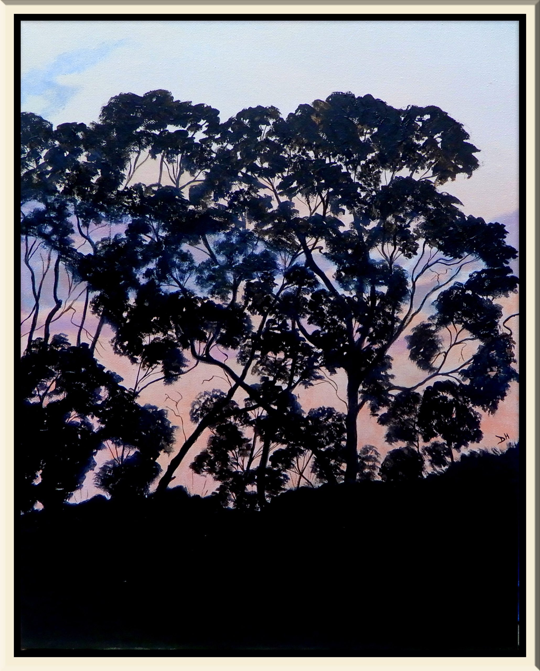 Gum trees in silhouette. Looking west, the rosy light of dusk shines through leaves like like patterns in lace.
