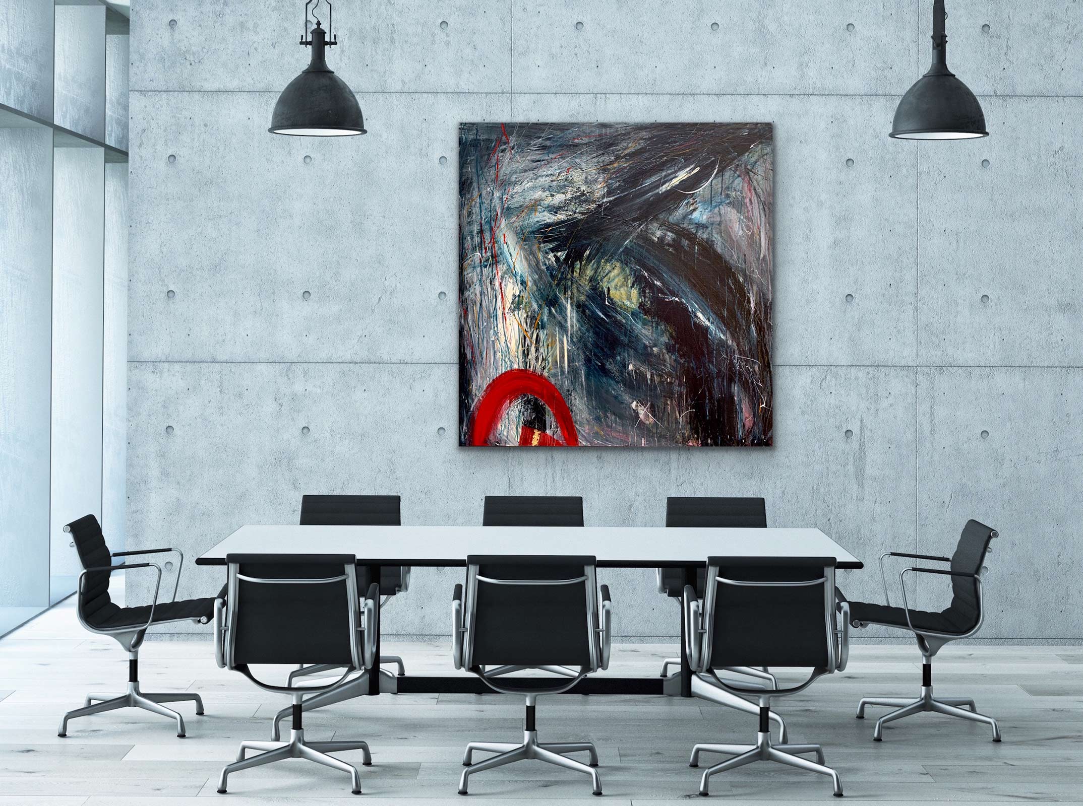 In the case of The Little Hill, Tania set herself the task of reducing, by means of the missing effect of (bright) colours, to focus even more strongly on the gestural dynamics and the forms of the composition whilst driving the eye to the red focal point.