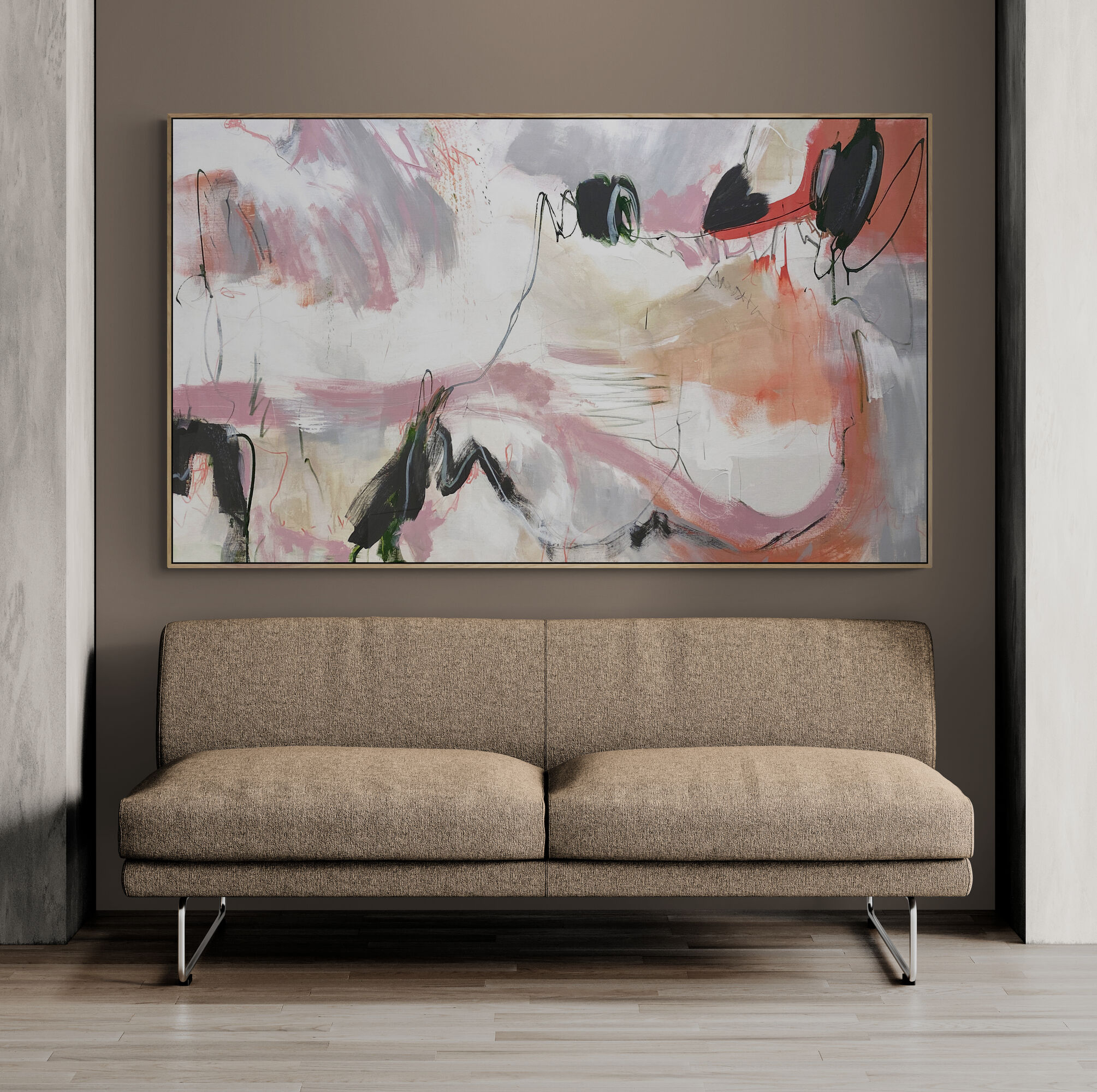 Acrylic and pencil marks in this abstract expression piece reflect on the entwined chaos and beauty of nature. The striking colours and lines across the canvas of blush, pink, peach, apricot, olive and light green, greys, white and beige will fill any space with an artwork full of vibrant energy of emotional freedom.