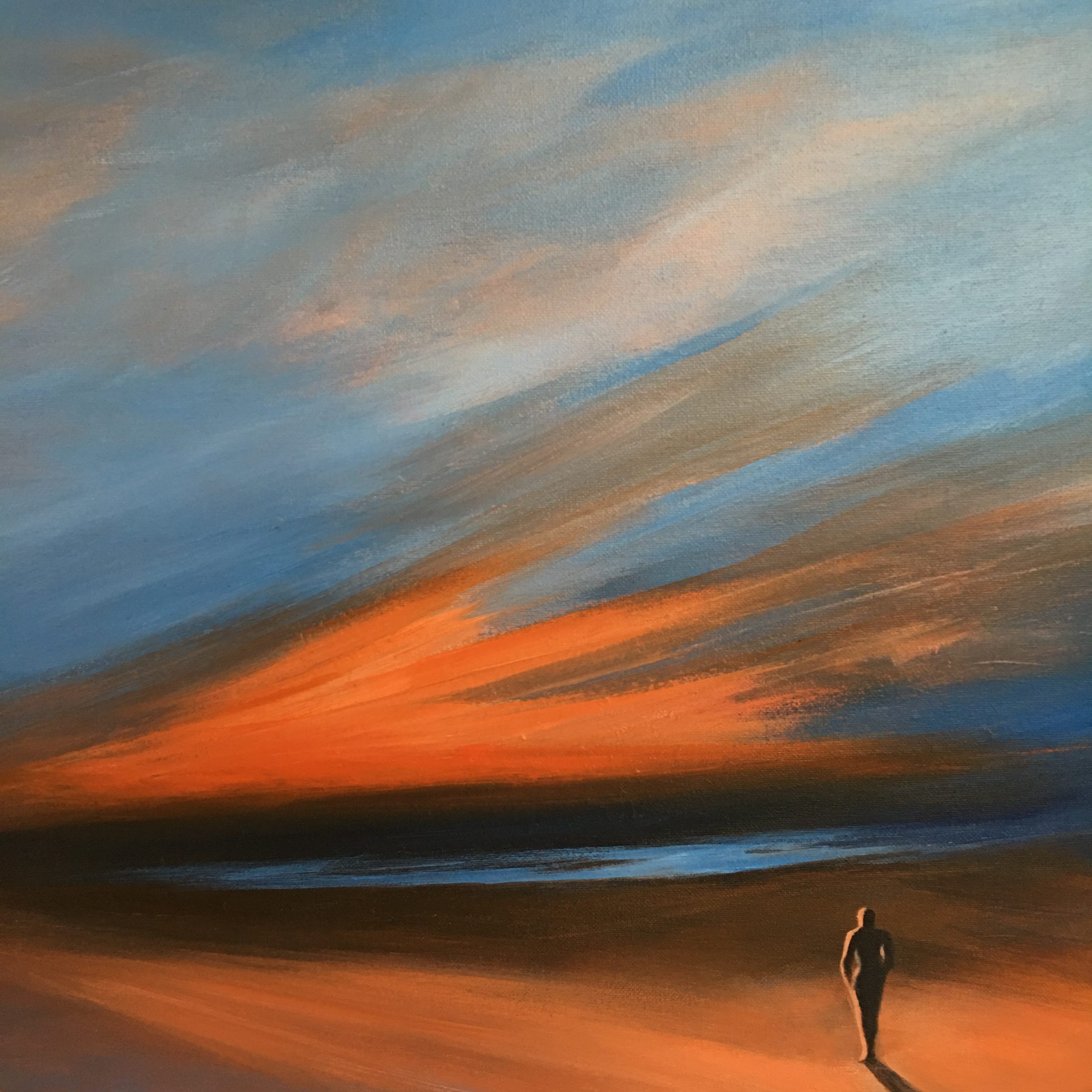 A surreal beach scene with a lone figure staring at the Horizon. The colours are warm. This is one of my signature paintings … I paint these pics of solitude when I do not want to use reference and just paint expressively from my mind.