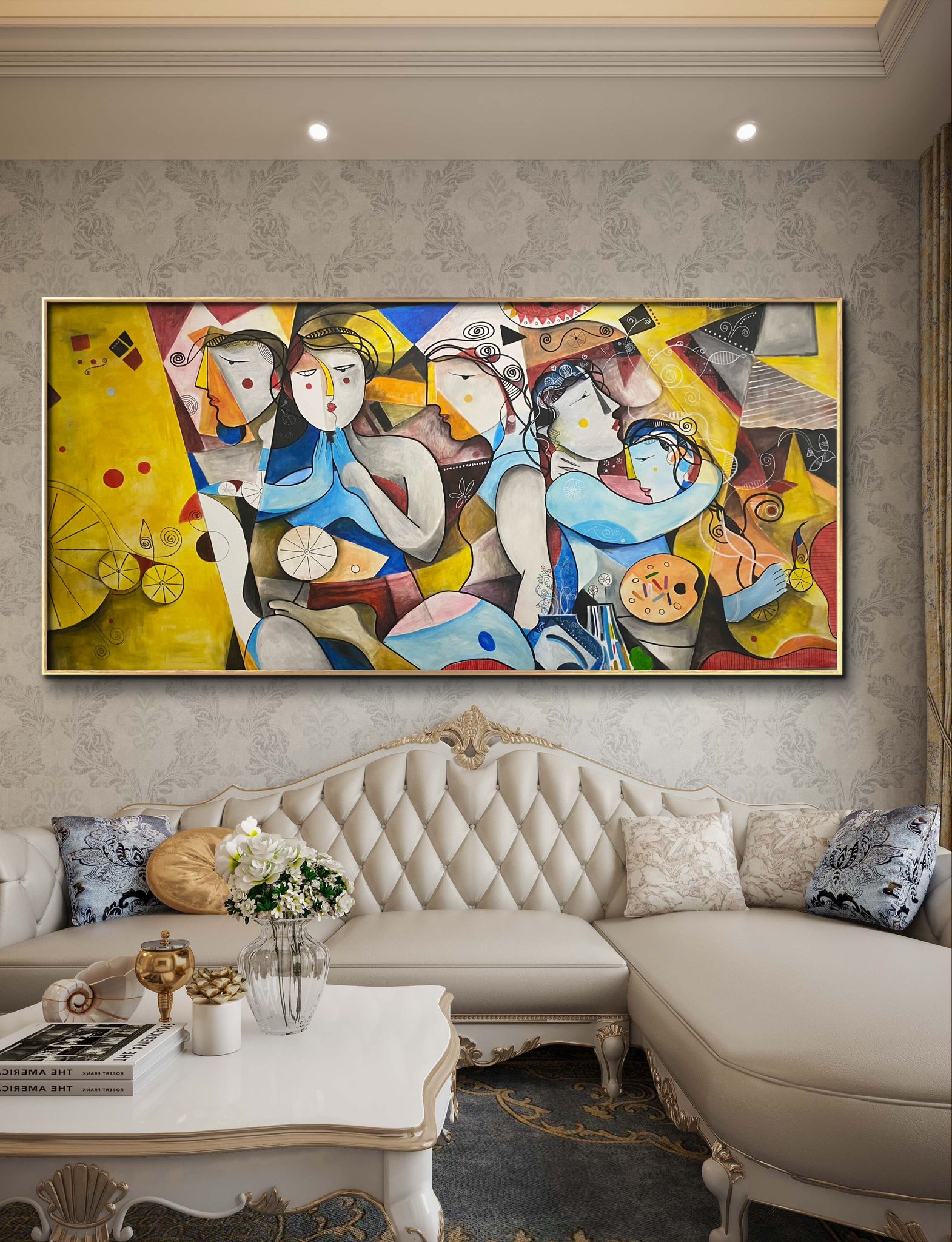 Modern contemporarty art with basic human shapes and postures mixed with some representation of arts. used more warmer colors and shades of cooler colors inbetween. with its size it can either suit for a living or dinning room or even a hall way.