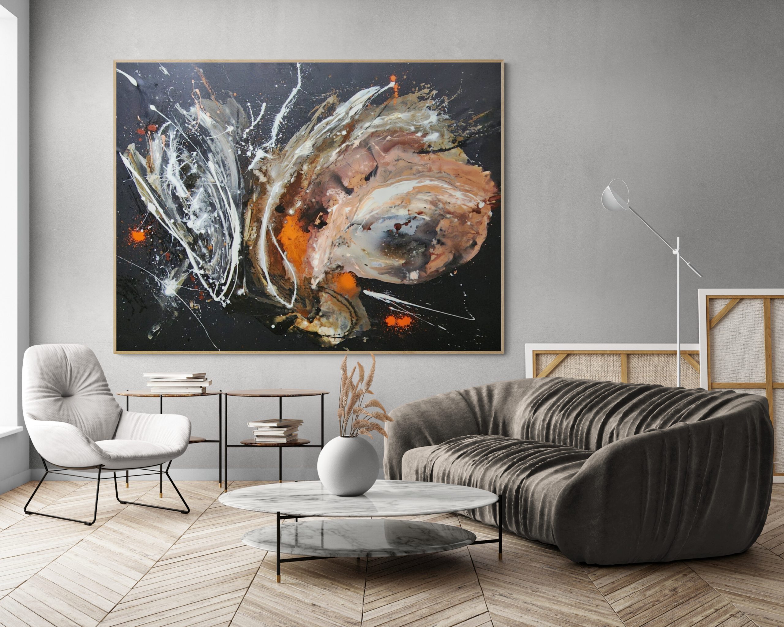 The Love Universe by Alina Zorkina is all about energy and movement. With bold splashes of white, warm earthy tones, and bursts of orange, it has this cosmic, galaxy-like feel that instantly draws you in.