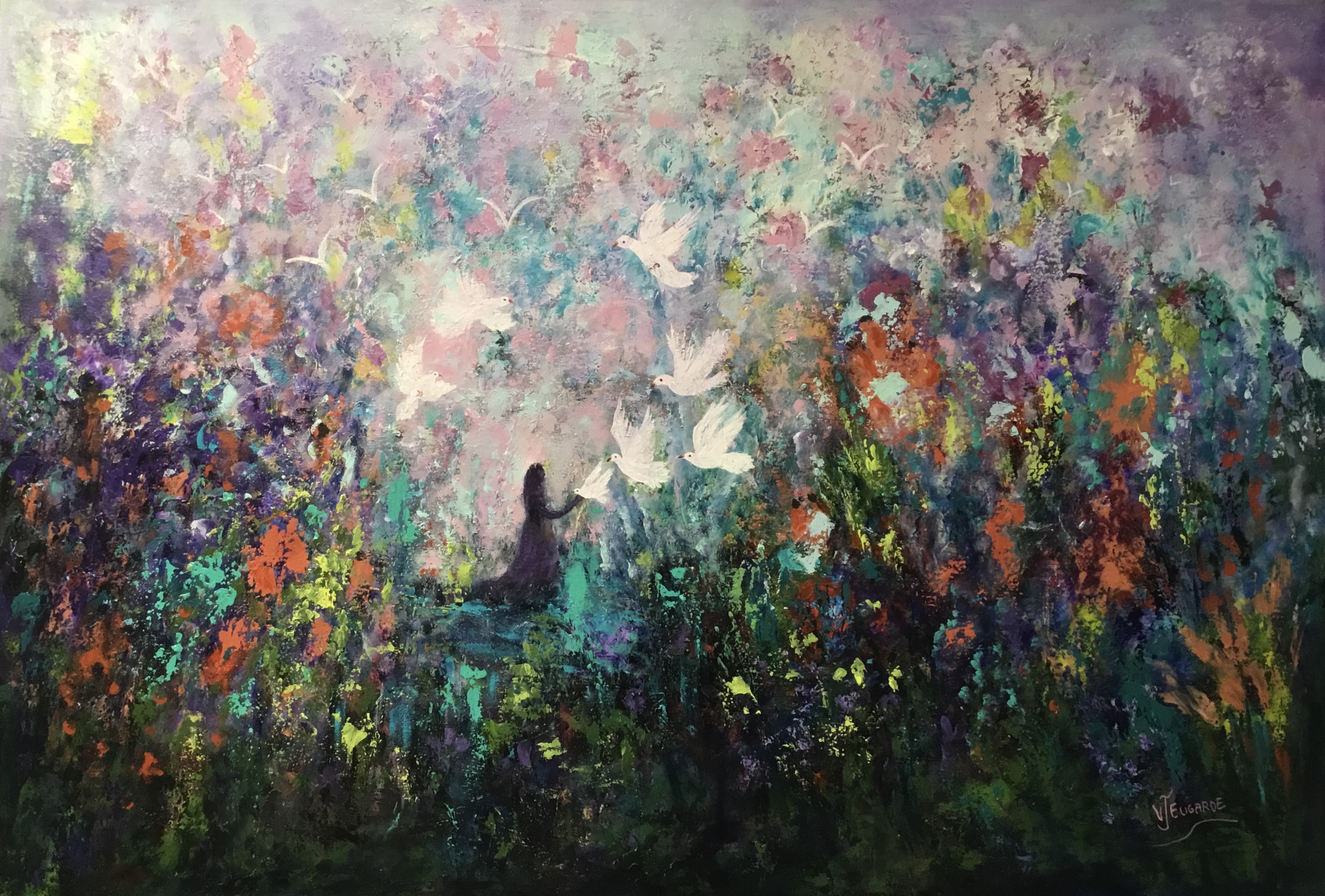 The Magic of Doves is impressionistic and intuitive, it began as a trip into my imagination, I love to just let a painting evolve without a preconceived idea, it is exciting because you don’t know what is around the corner.
