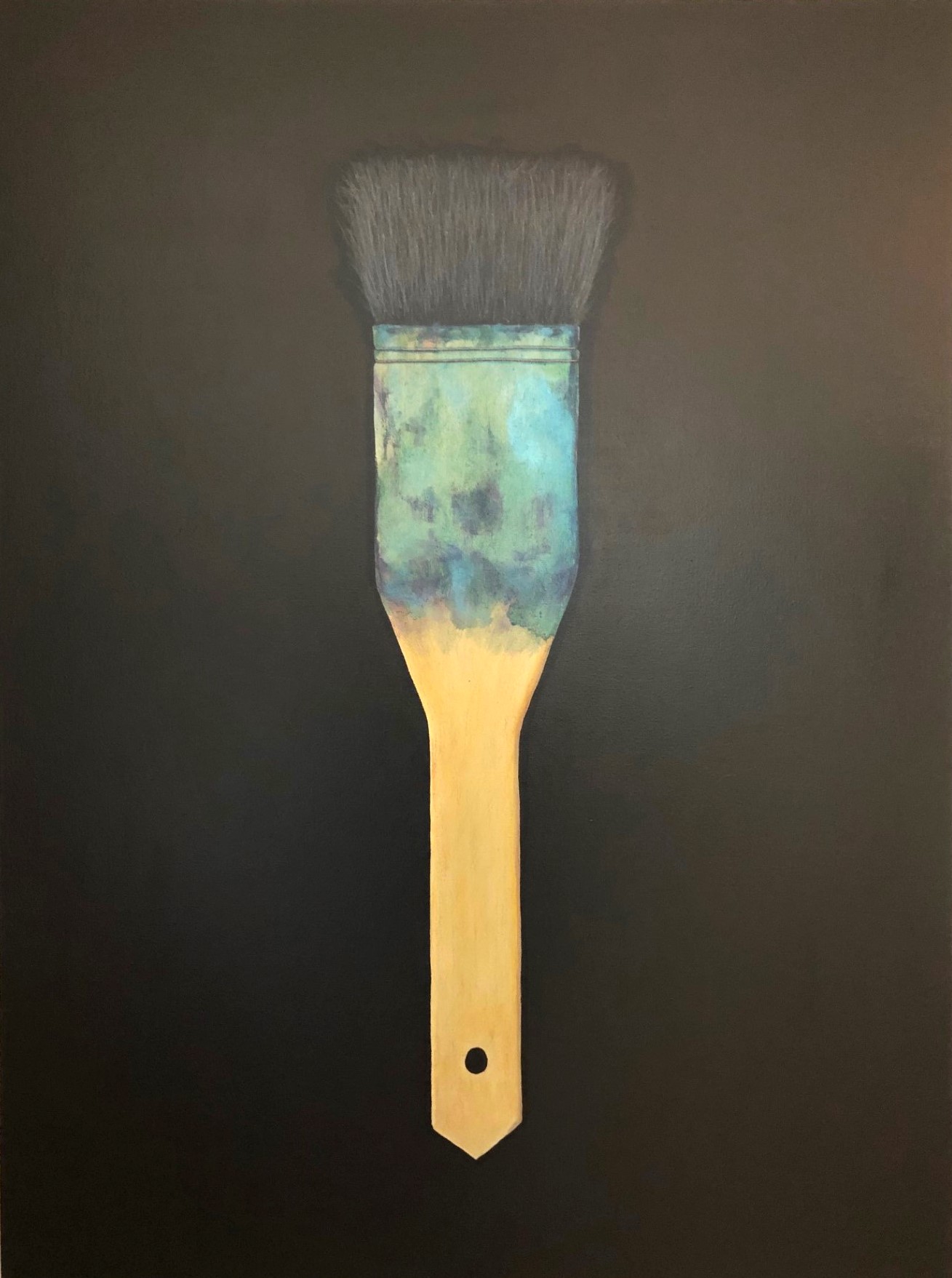 Michelle Nixon’s meticulous rendering of texture and tone imbues the painting with a quiet reverence, elevating the everyday tool into a symbol of artistic devotion. The contrast between the luminous wooden handle and the shadowy void surrounding it invites reflection on the act of creation itself—where ideas emerge from darkness and take form through the artist’s hand.