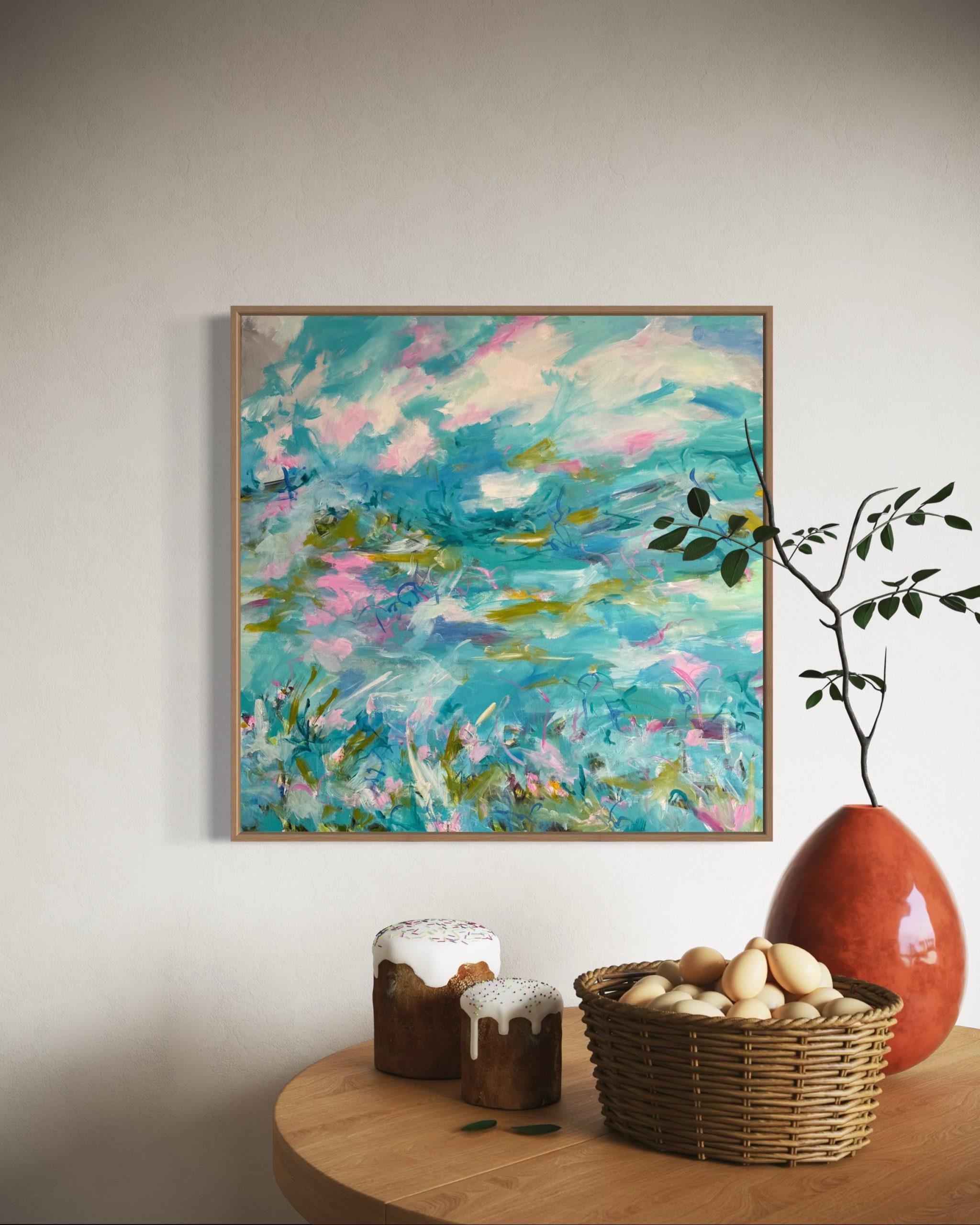 The bottom section incorporates energetic green and floral tones, resembling a meadow or garden. The overall composition feels bright, airy, and uplifting, with a dreamy, impressionistic quality.