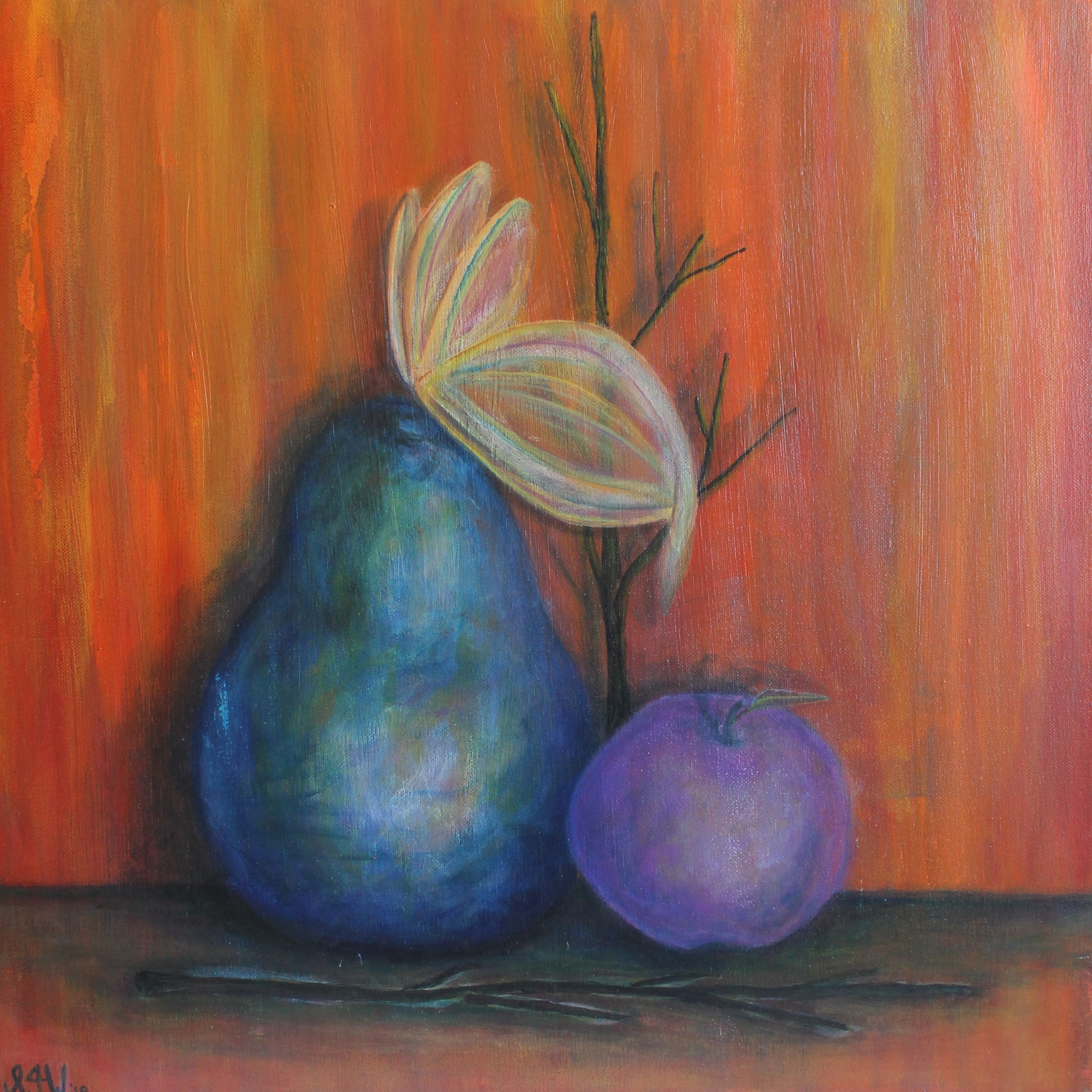 I used the sheer nature of the fruit, and butterfly in this piece to symbolise the veneer of change, you can actually see the background through these objects.