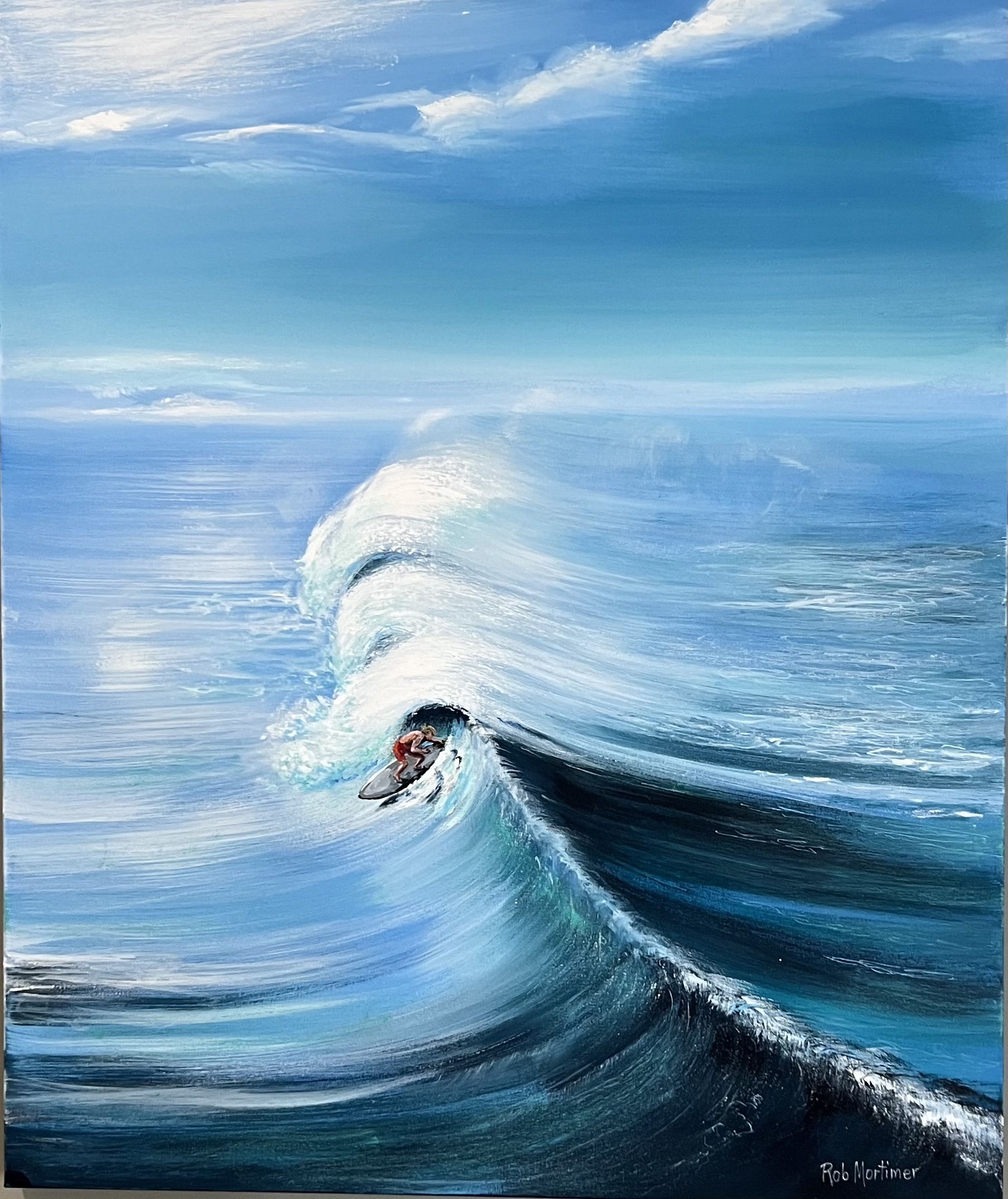 Original. Acrylic, on stretched canvas Return edges painted. The SURFERS HEADING HOME AFTER A MORNINGS SURFING. Protective clear coats – Hooks and wire across back. on quality stretched canvas.