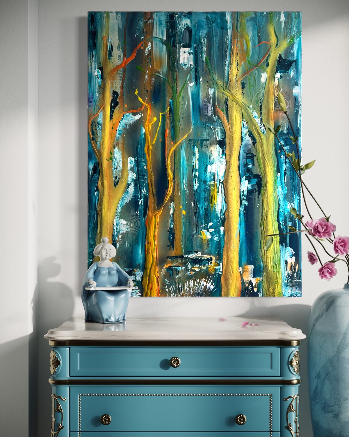 This tree painting carries the gorgeous energy of the ghost gums located in Kings Park, Western Australia. The paint is loosely applied in layered texture, implying the evening light on its trunks. The featured orb transmutes the forest’s energy on the canvas and into your home. It’s symbolic of the life force the forest holds.
