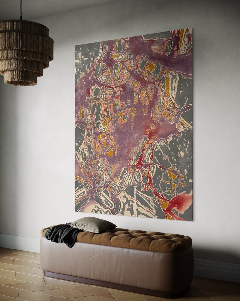 This exclusive piece captures the sensation of unfamiliarity through tangled pathways, ruptured layers, and shifting fields of colour. The work evokes the disorientation and curiosity of entering an uncharted emotional or physical space.