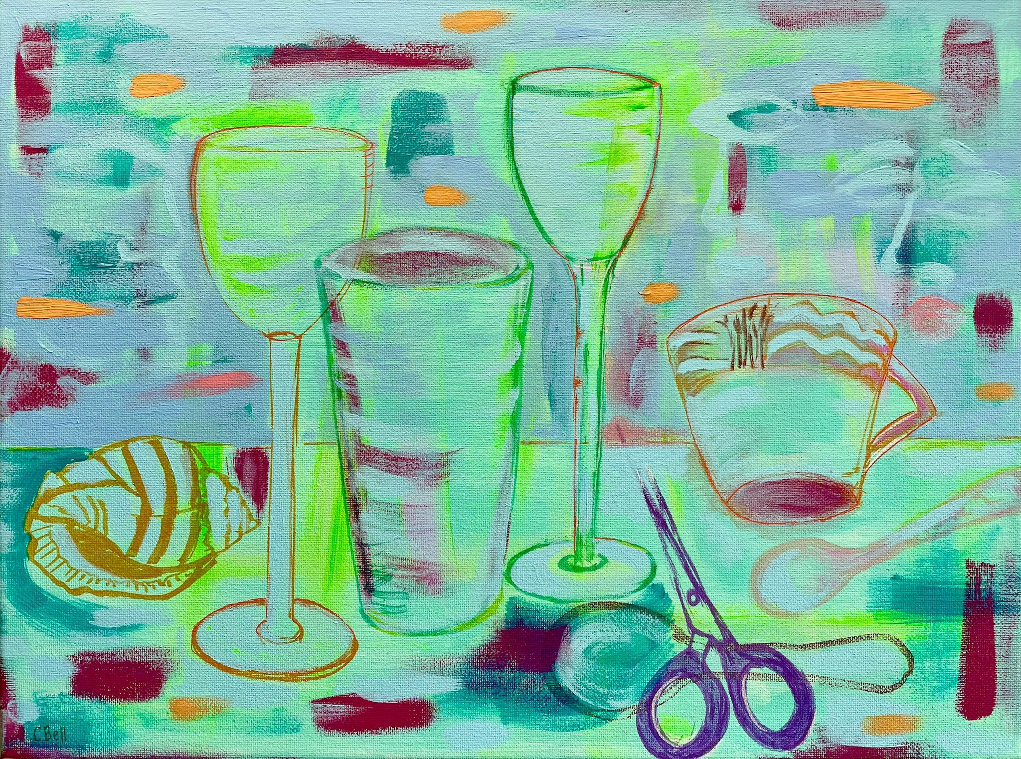 I felt inspired to arrange a still life composition with things on the table at the time, drinking glasses, china, scissors and a shell to create a slightly offbeat mix of pieces.