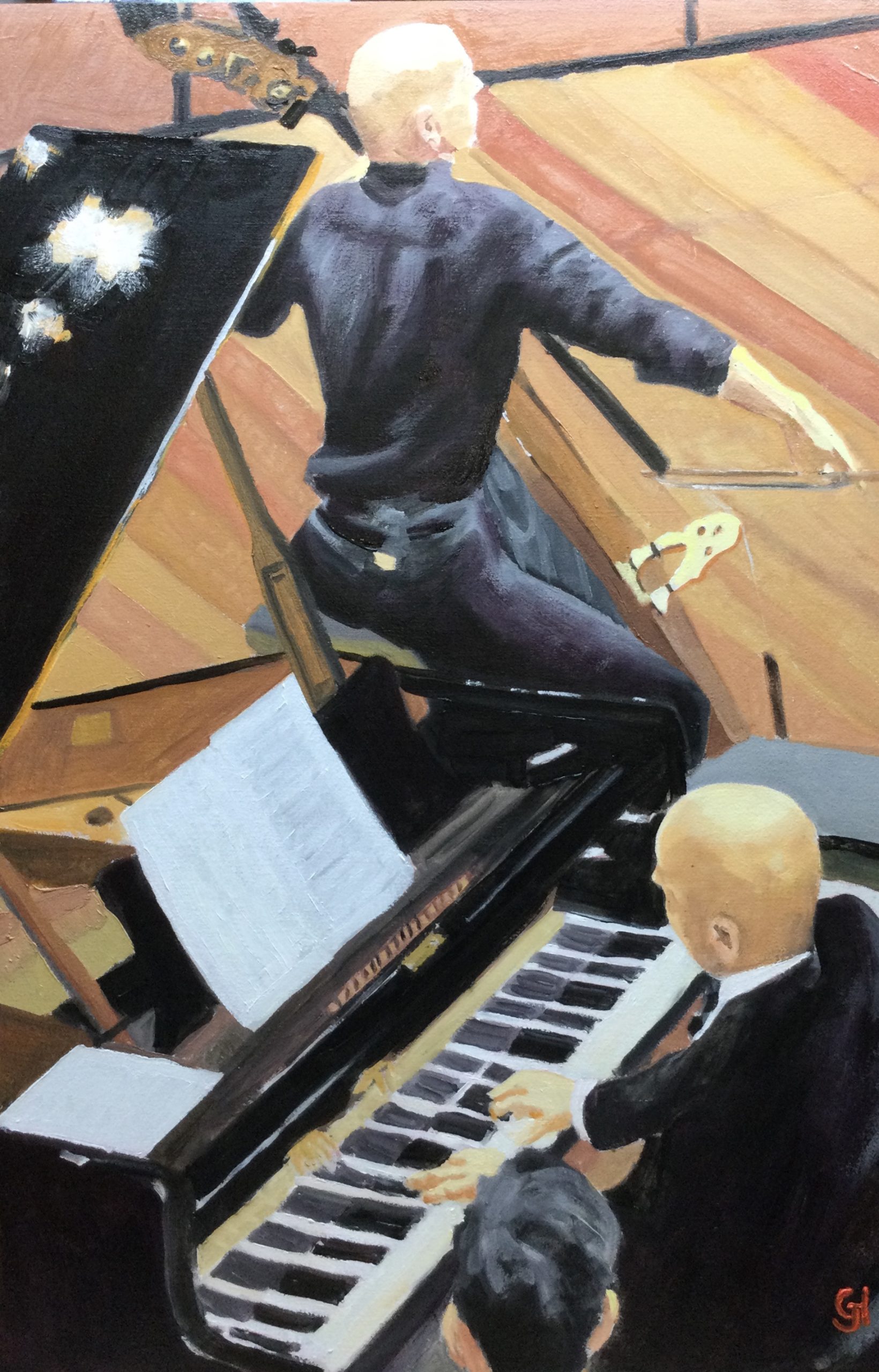 ACO Principal Double Bass Maxime Bibeau, Joined by pianist Simon Tedeschi, performing at the inaugural show at ACO’s new Theatre “The Nielson”. We were seated above the performers on the balcony. The view form the balcony made for an interesting composition for this painting. oils on a cradled wood panel 40x 60 cm, ready to hang. sides painted black. oils on a cradled wood panel 40x 60 cm, unframed, ready to hang. sides painted black.