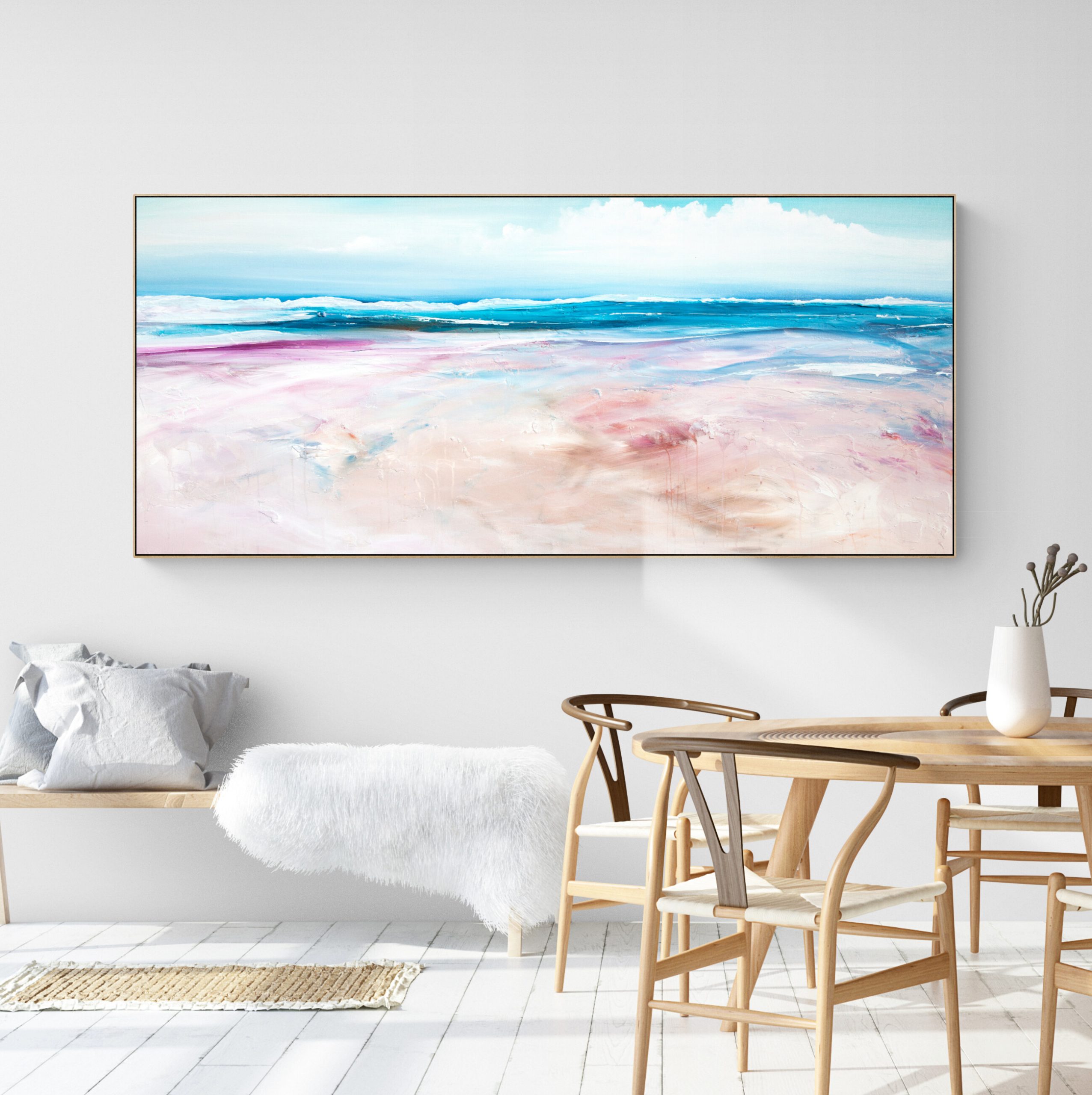 The Ocean’s Dance by Tania Chanter is inspired by the rich and vibrant tones of an Australian seascape and the changes of light and mood throughout the day. Tania’s hope is that this painting brings a sense of calm to the room where it lives, and that is makes the people who enter the room feel as though a part of nature is right there with them.