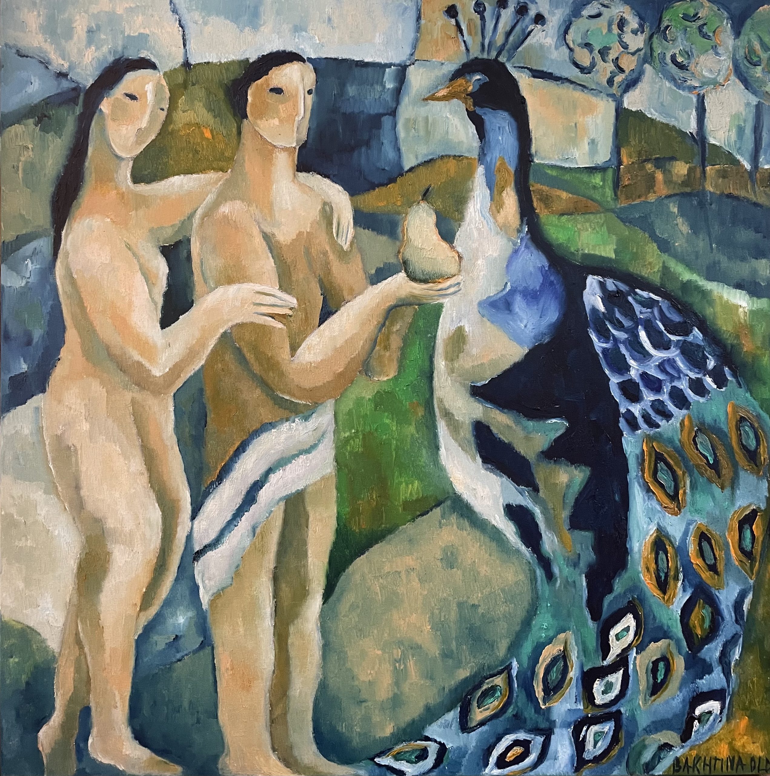 The Offering – One of the paintings from Olga Bakhtina’s series ‘Inner Garden, Secret Garden’ which is a collection of paintings in which every work is a story being told. ‘The Offering’ is a celebration of love and the joy of living. Adam and Eve are offering a pear, a traditional symbol of affection and love, to the peacock which is a symbol of protection, good luck, and immortality. Size: 91cm x 91cm x 4cm. Ready to hang. Edges painted black. Can be hung framed or unframed. The series is an attempt to create a dreamy new world of harmony, a civilisation of peace and serenity, where dreams come true, and worries do not exist. The series depicts figures in landscapes that become the perfect artistic playground for exploring geometry and colour relationships whilst still creating adventure and harmony.