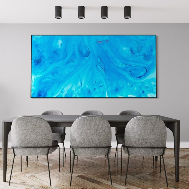 The painting does’t come with the external frame. The images attached are representations of what it could look like after being framed. No hanging wire.