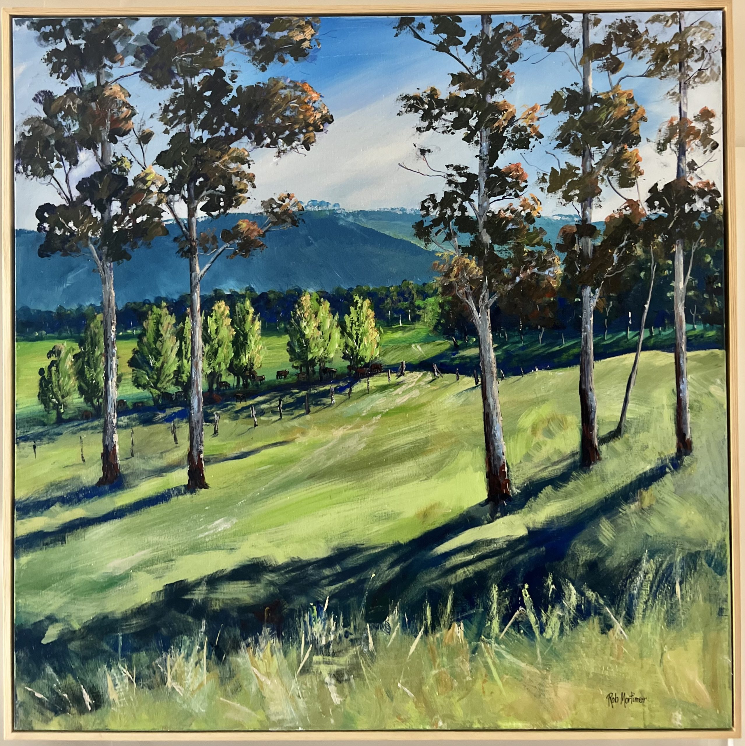 Original. Acrylic, on stretched canvas. The rural beauty of the southern Queensland ranges. Protective clear coats – Hooks and wire across back. on quality stretched canvas. Timber float frame