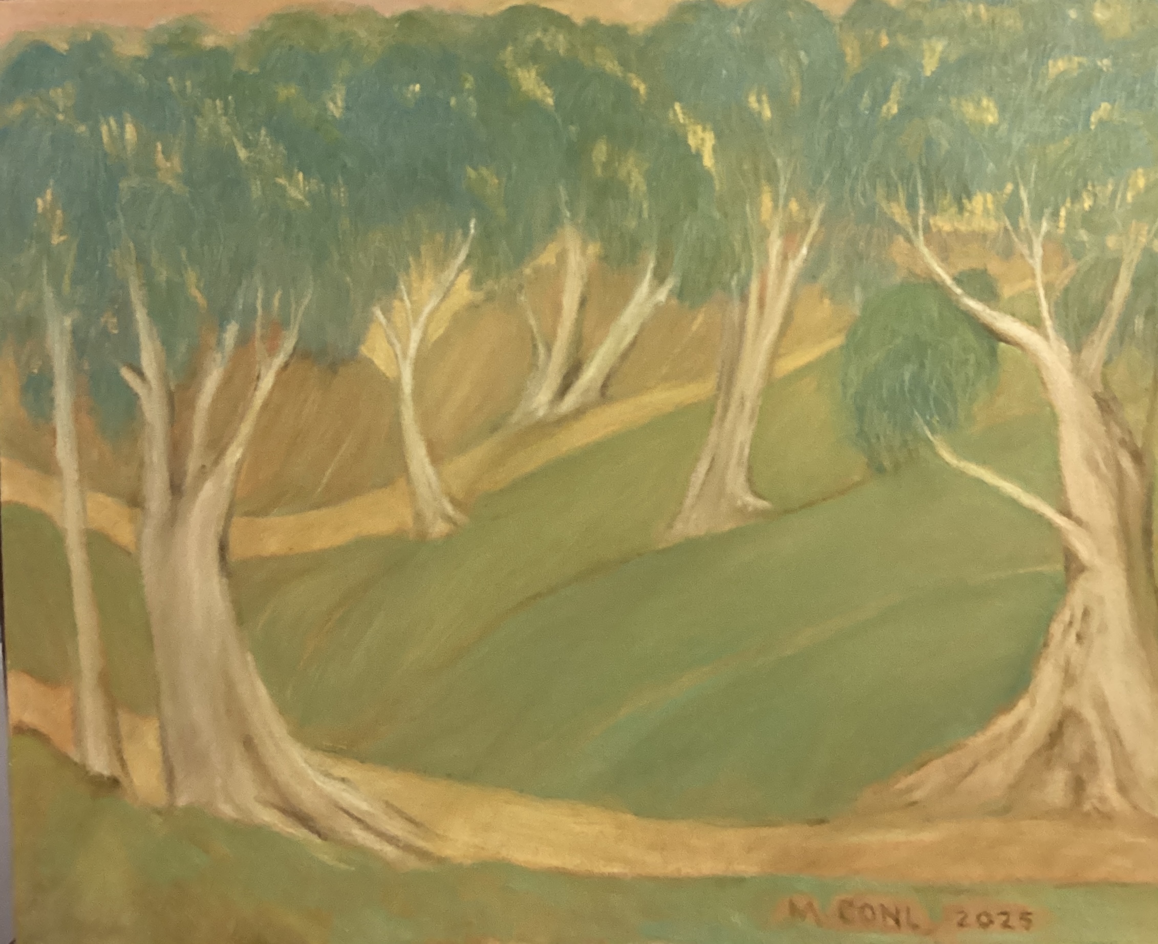 The Path is an original oil painting by Margaret Connell.The image was the result of Margaret feeling à need to paint something different and was derived from squiggles on the canvas that seemed to point the direction the painting took.The image was helped along by Margaret’s memories of à past experience in the hills . Italian primed canvas was stretched over à frame.Good quality oil paint was used and a fine glaze used to seal tge painting. D hooks are attached and the painting is ready to hang.