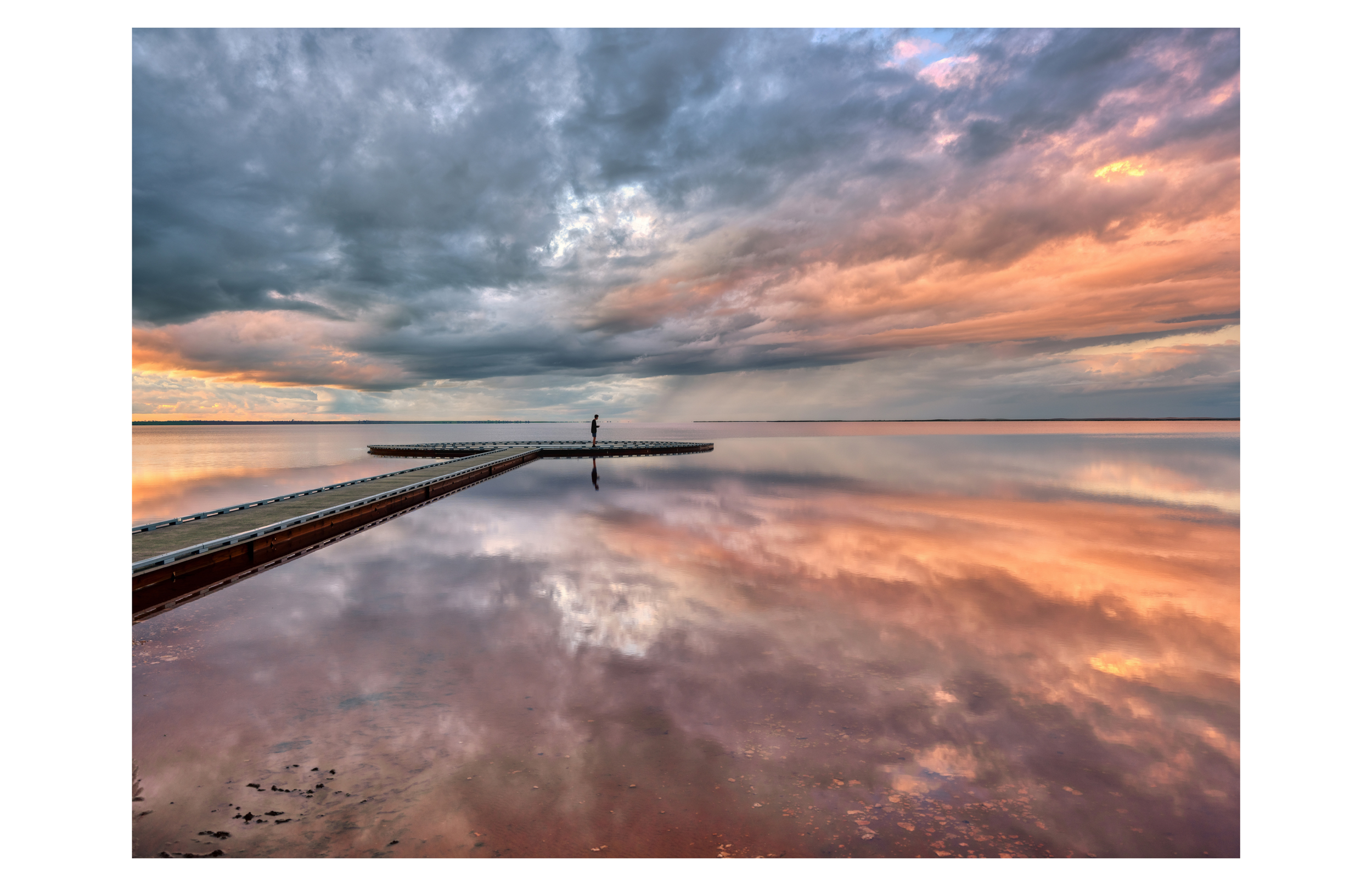 Captured at Lake Tyrrell in Victoria, Australia, this photograph presents a moment of sublime, otherworldly beauty. The highly saline water, coloured a stunning hue of rose and crimson by its unique ecosystem, transforms the landscape into a vast, flawless mirror. The dramatic sunset clouds—a turbulent mix of deep charcoal and glowing apricot—are reflected with perfect symmetry, blurring the line between sky and earth. A solitary figure stands on the simple timber jetty, offering a powerful sense of scale and contemplation. This piece is an ethereal exploration of Australian salt lake majesty, the power of reflection, and the profound solitude found in nature’s grandest spectacles.