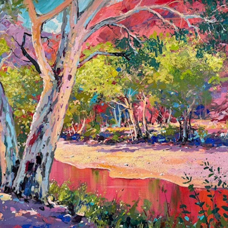 Ready to hang with d-rings and hanging wire. Unframed. The painting wraps around the sides so a frame is optional. An original painting. Signed in the lower left hand corner ‘A. Gilchrist’. Protected with a matte spray varnish.