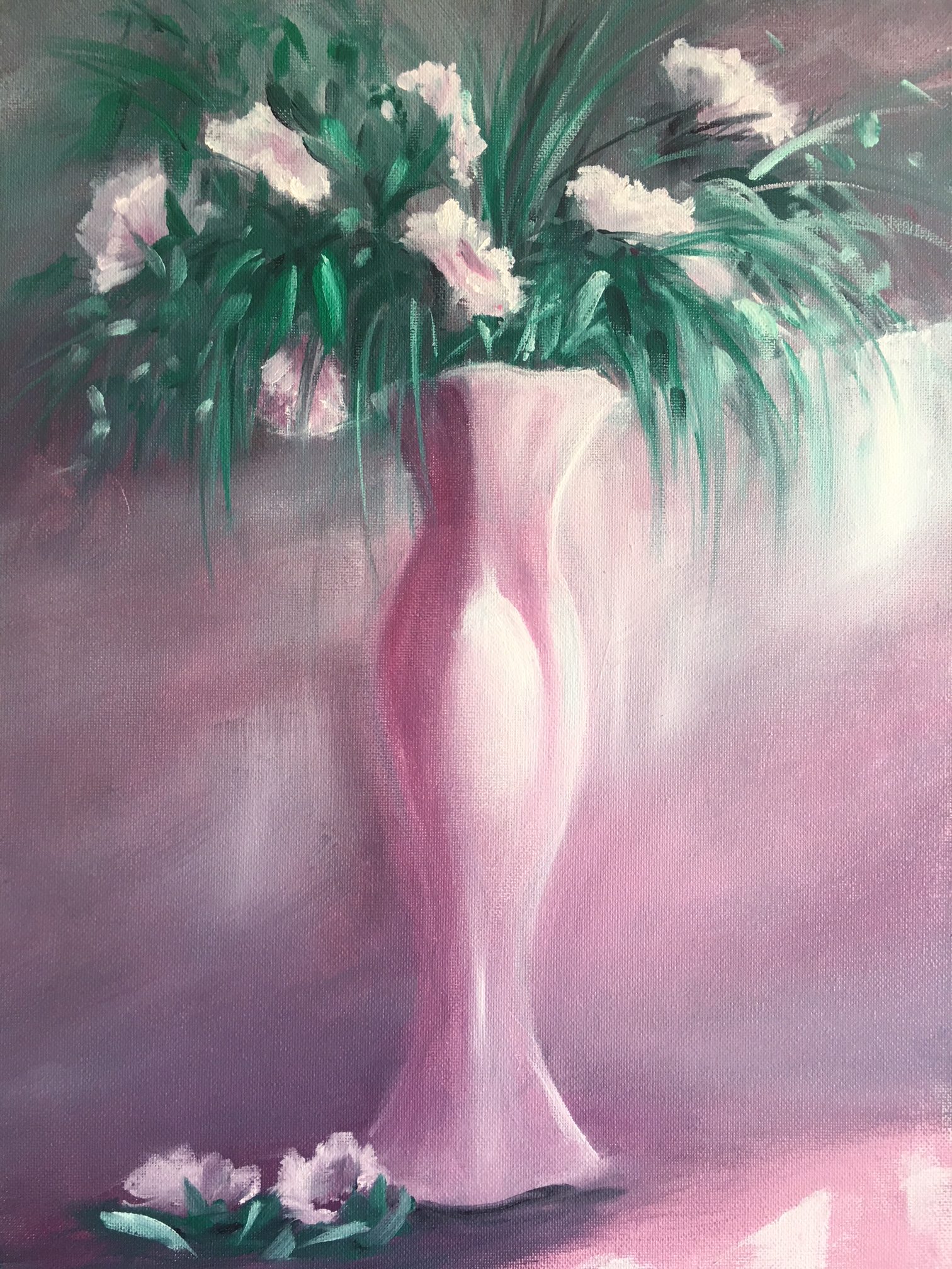 The Pink Vase by Kathryn Johnston – I guess this painting was inspired by the shape of the vase. It reminded me of the shape of a beautiful woman. It looks beautiful in a bedroom or living room and the soft pastel colours work in well with charcoals and greys. It is an oil painting on stretched canvas and ready to hang.