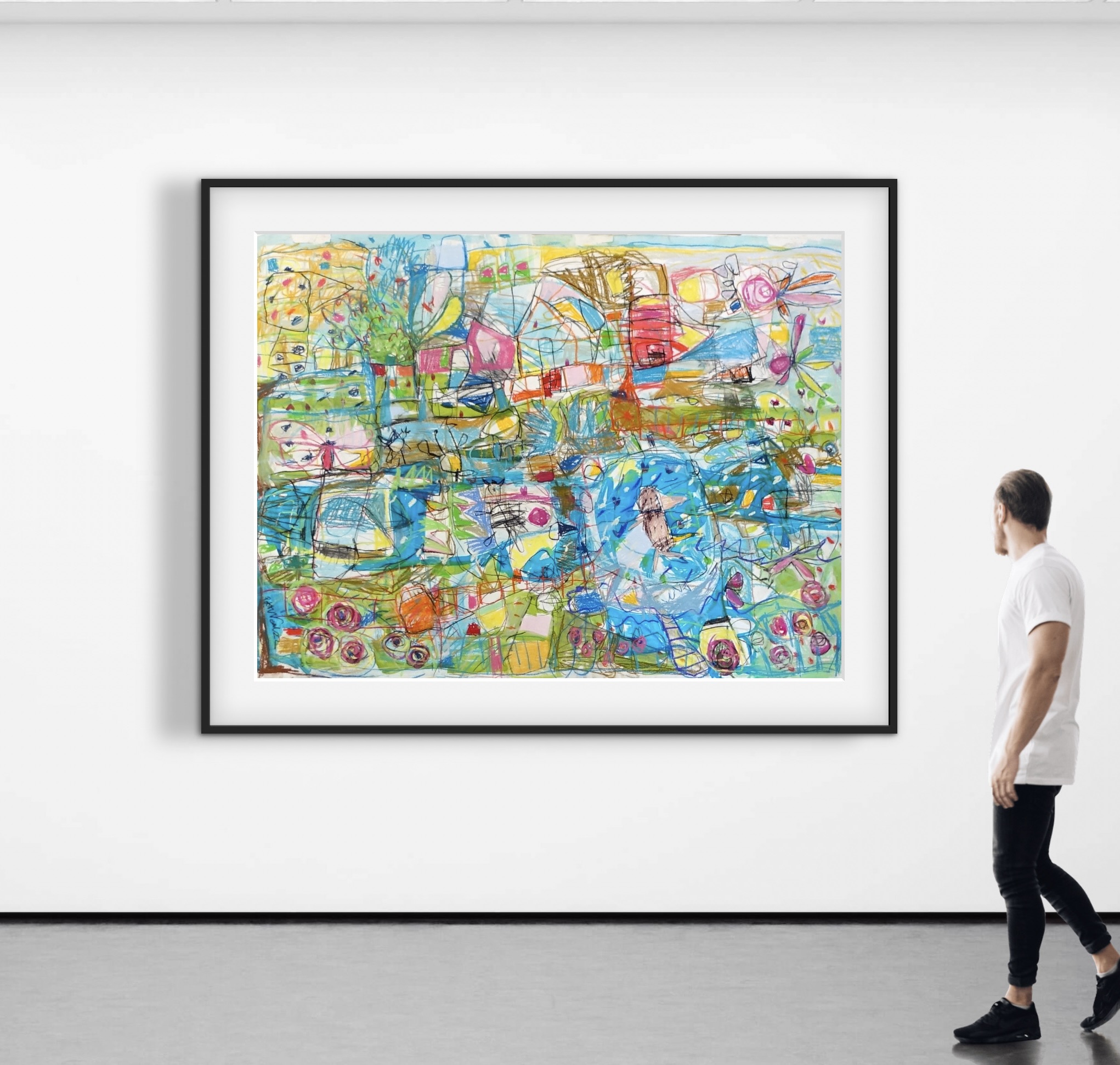 This work is 90cm X 120cm from edge to edge. it is signed on the front and sent with a certificate of authenticity. It is sent unframed in a roll and will need to be framed to hang. With drawings it is best but not essential to hang them with mounting board around the edges as in the images shown. If you add mounting board please make sure to add the width of the mounting board to the size when measuring for space. I recommend matching the frame around the work to your home rather than to the painting ie if you have a lot of timber use a timber frame. But I have given images with different frames for you to see.