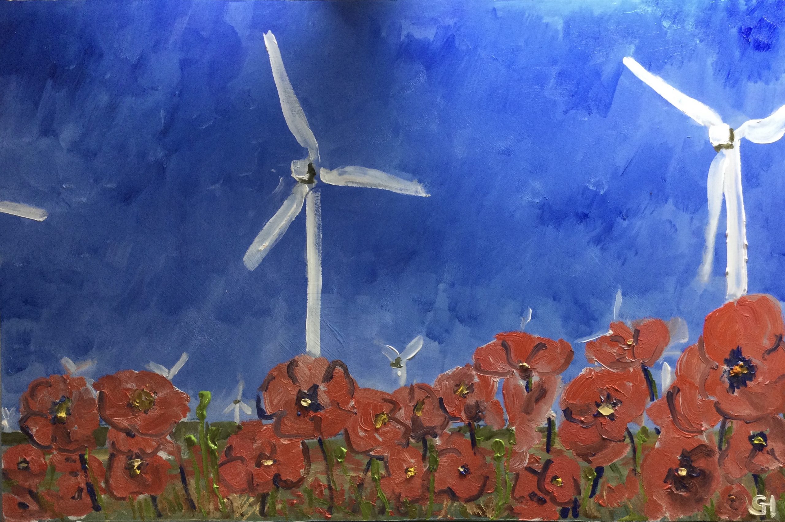 The Plain in Spain by Geoff Hargraves – Travelling across Spain from Seville to Madrid, Don Quixote wouldn’t know which way to look. So many wind towers. Also in Spain the Amapolars grow wild. (Spanish for Poppies). This oil painting combines both.
