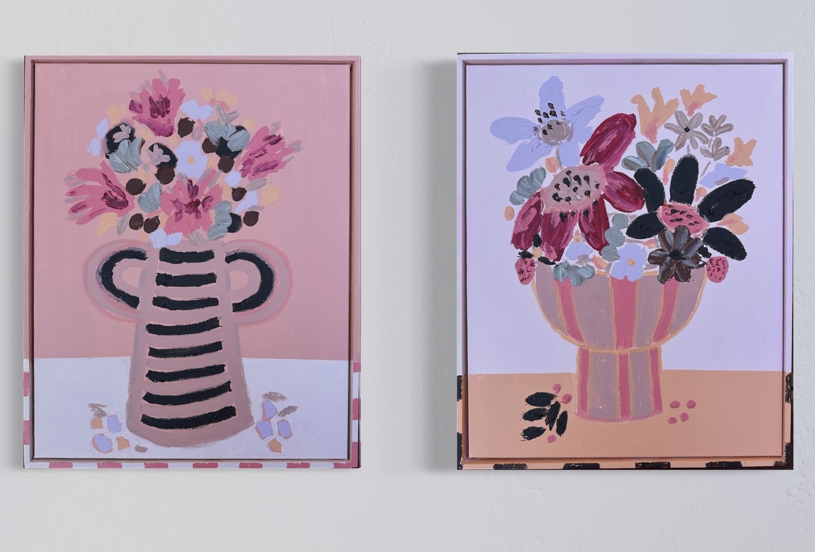 The Poetry of Vases captures the quiet lyricism of flowers gathered in simple vessels, painted in soft blush tones and textured brushstrokes. Each vase becomes a storyteller, holding blooms that sing of joy, tenderness, and fleeting beauty. Side by side, the two canvases create a gentle dialogue — a duet of colour and form — reminding us that even the humblest vessels can carry abundance and grace.