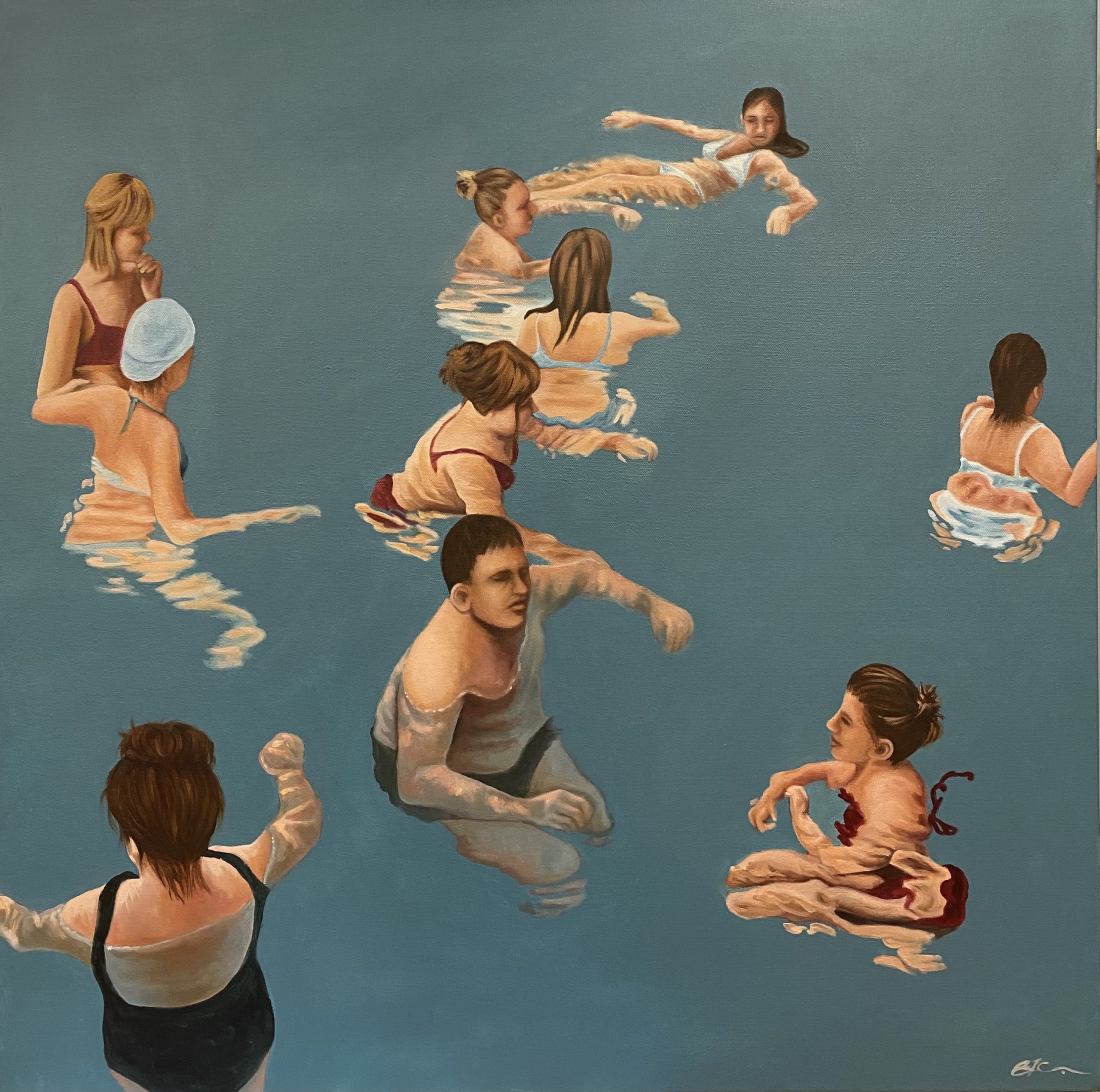 The Pool by Amanda Cameron – One of my ‘Summer Series’ of paintings and is an investigation into the interaction and connection between perspective, realism and colour. Amanda’s work is focused on the quest for finding refuge, quietness and escapism. Some [paintings] focus on the lone swimmer, the few minutes of introspection when submerged in the warm quiet of water, and others investigate the interaction of people within various aspects of the landscape. I haven’t settled on any particular style, and constantly struggle with the juxtaposition between hyper-realism and having a painterly quality to my art and this conflict in my paintings is what I am always trying to balance. This piece is painted in professional quality oil paints on a museum quality canvas, and finished with edges painted and a gloss varnish for protection. It comes with hanging wire and a certificate of authenticity.