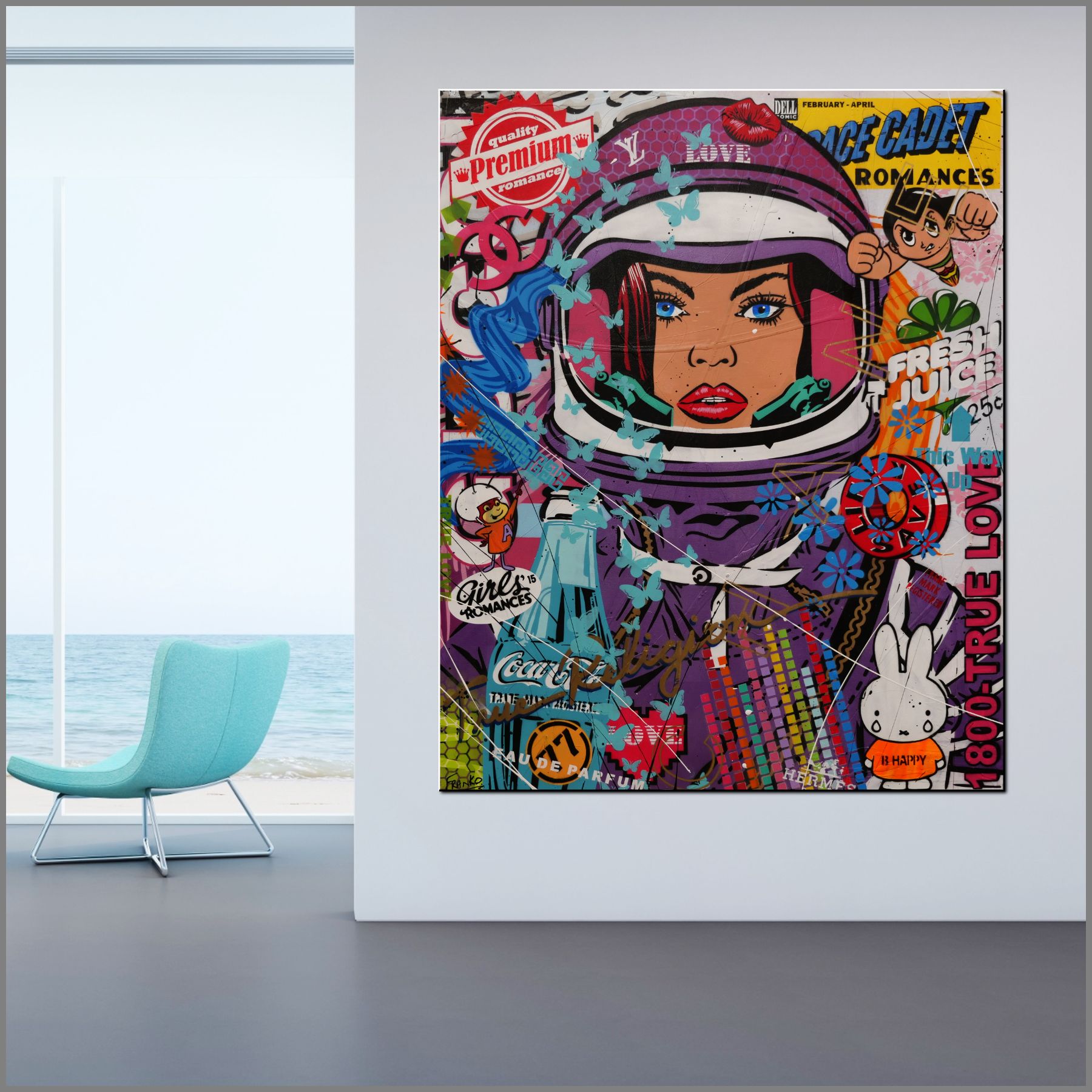 I create all of my “Urban Pop” pieces with a partial textured base and in a grungy manner to replicate something of an “urban” wall type look. I use some forms of Brandalism to replicate advertising on walls. Throughout these pieces, you will see disingenuous tags like “Genuine Romance” “ 1800-True Love” “Never seen before” “This will change your life” “Genuine Taste” etc etc to poke a bit of fun at the constant bombardment we all get of things that are bordering on truth and outright pulling the other leg. I use a lot of this for balance, layering and colour within the canvas as well.