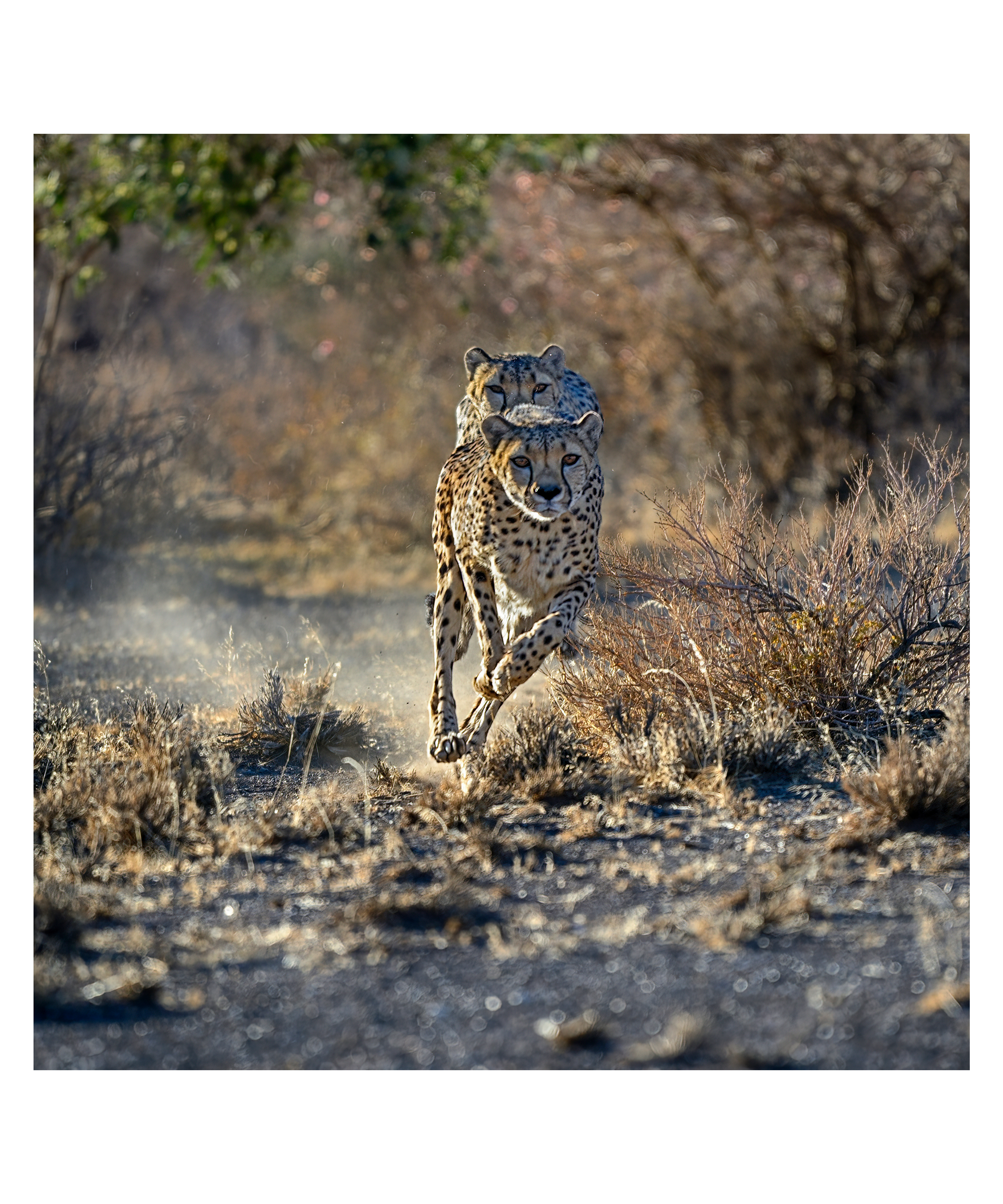 Captured in the raw, sun-drenched wilderness of Namibia, this photograph immortalizes the raw power and singular focus of the world’s fastest land animal. Two cheetahs are seen in mid-sprint, their bodies a blur of kinetic energy and spotted camouflage against the golden scrub of the savannah. The low-angle perspective creates an immersive experience, making the viewer feel the intensity of the chase and the kick of the dust. This piece is more than a wildlife study; it is a testament to the primal elegance of survival and the breathtaking speed that defines the African plains. A perfect addition for collectors who value high-action nature photography and the spirit of the wild.
