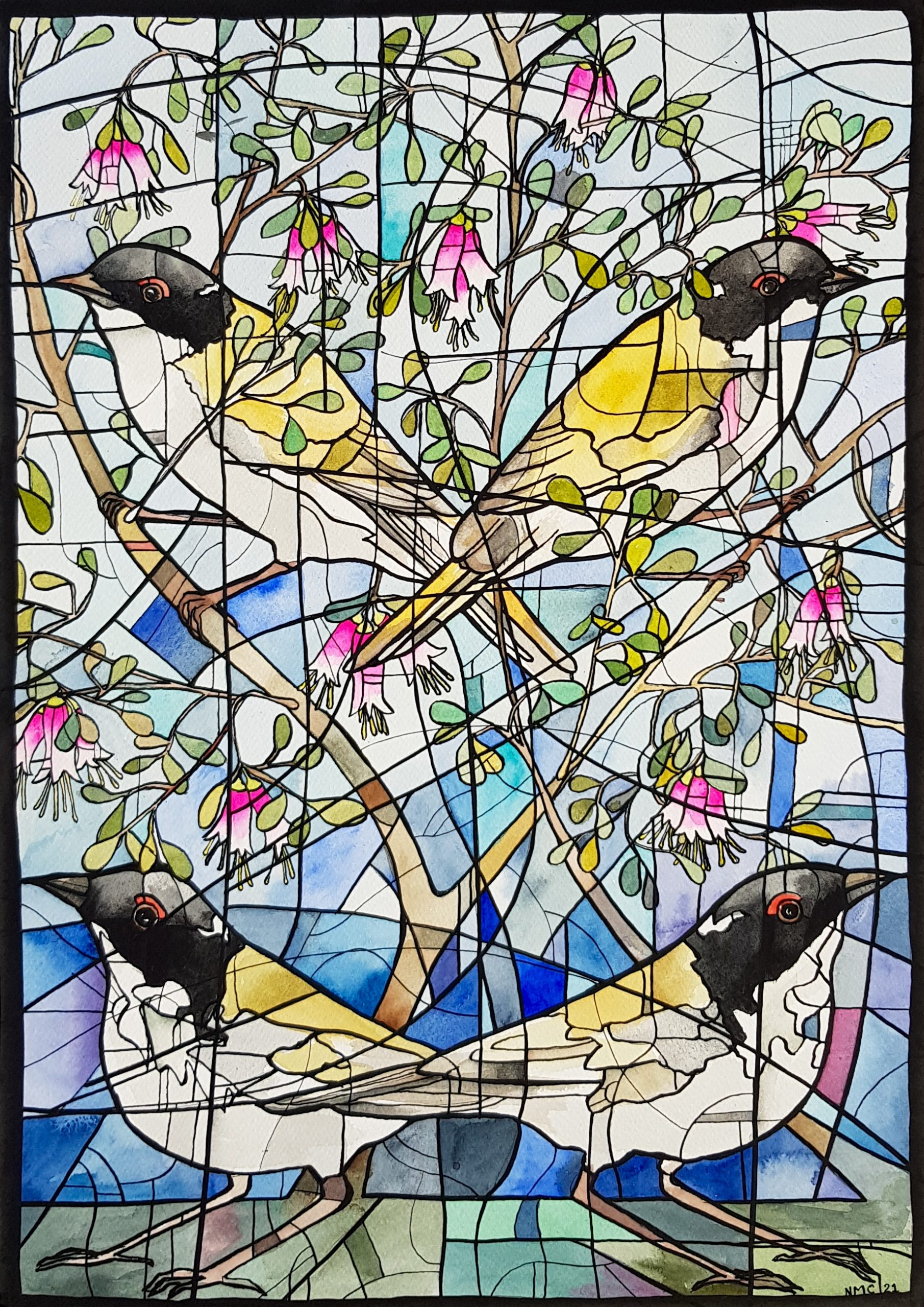 The Quartet by Nicola Cowie –Â The Quartet is a stylized depiction of sweet White-naped Honeyeaters and a Correa bush in a loosely symmetrical design.