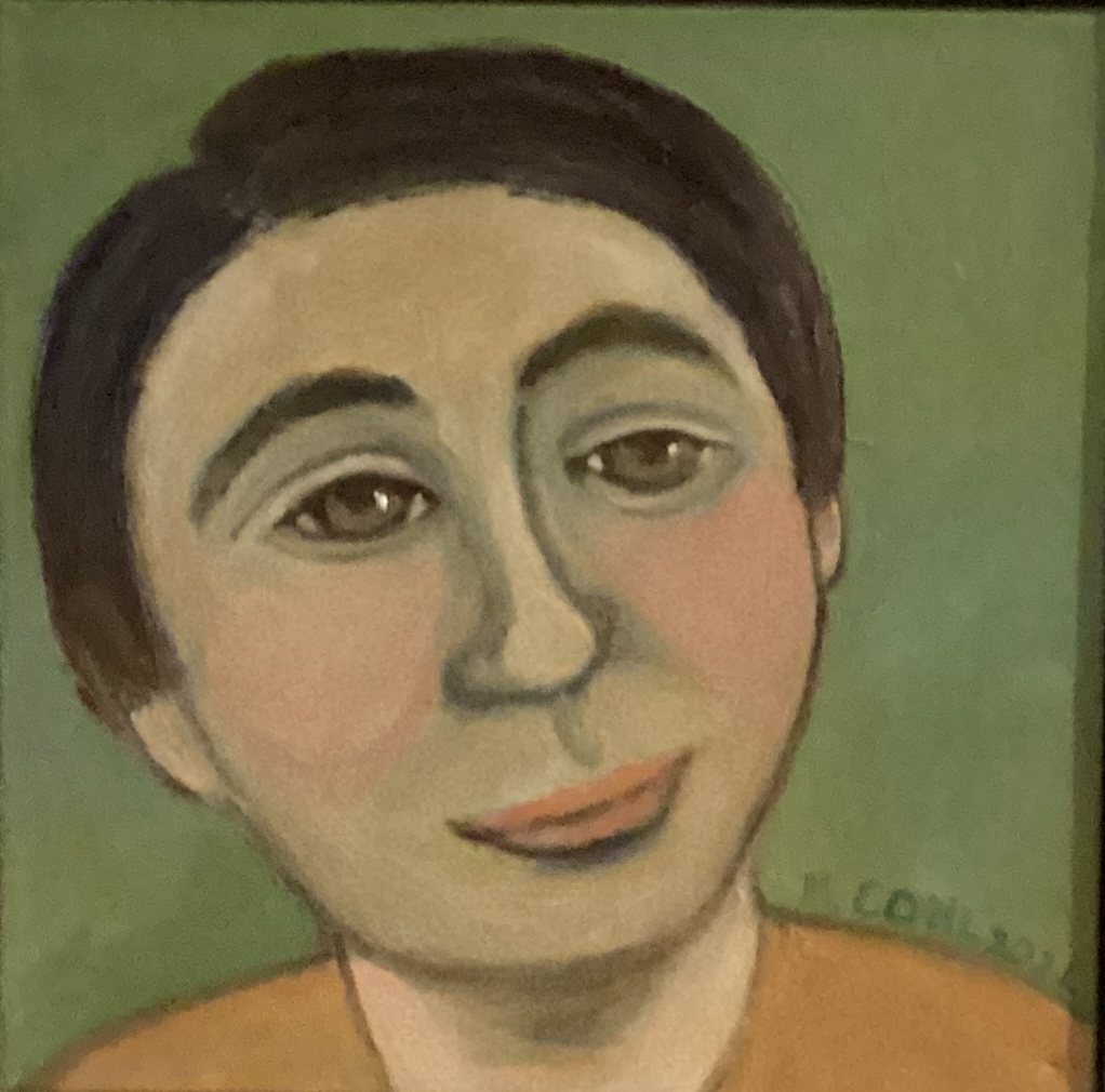 The quiet boy  by Margaret Connell – The image is of a boy Margaret encountered as a child and was created from traces of memory of him .The paint colours are used to engender quiet and calm to depict the memory of the boy and a face was chosen because of Margaret’s life long interest in peoples faces and depicting them in drawings  and paintings  .Margaret uses colour to depict emotions but also colours are chosen to enhance another colour .This painting is original.
