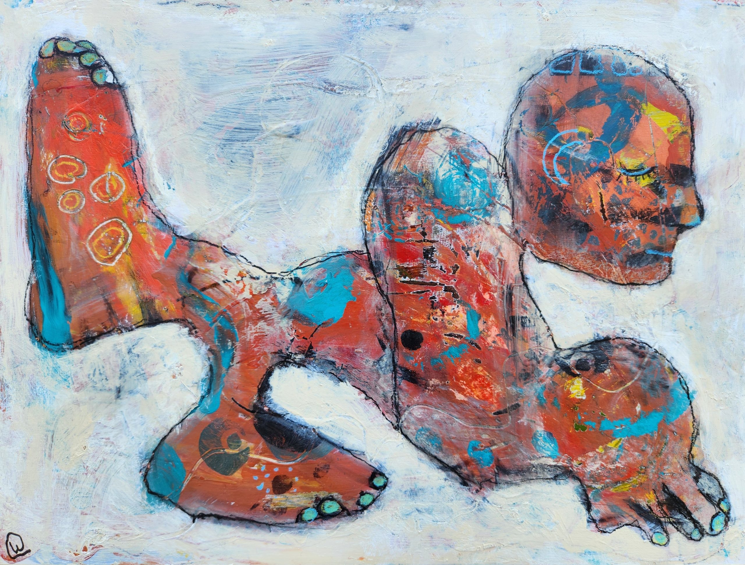 “The Retreat” presents an ironic lens on contemporary lifestyle choices, where the pursuit of peace, wellness, or ‘getting away from it all’ often mirrors the very chaos it’s meant to escape. Using layered mixed media on wood—a surface both grounding and raw—the work invites viewers to question what we choose to call “balance” in a world of contradictions.