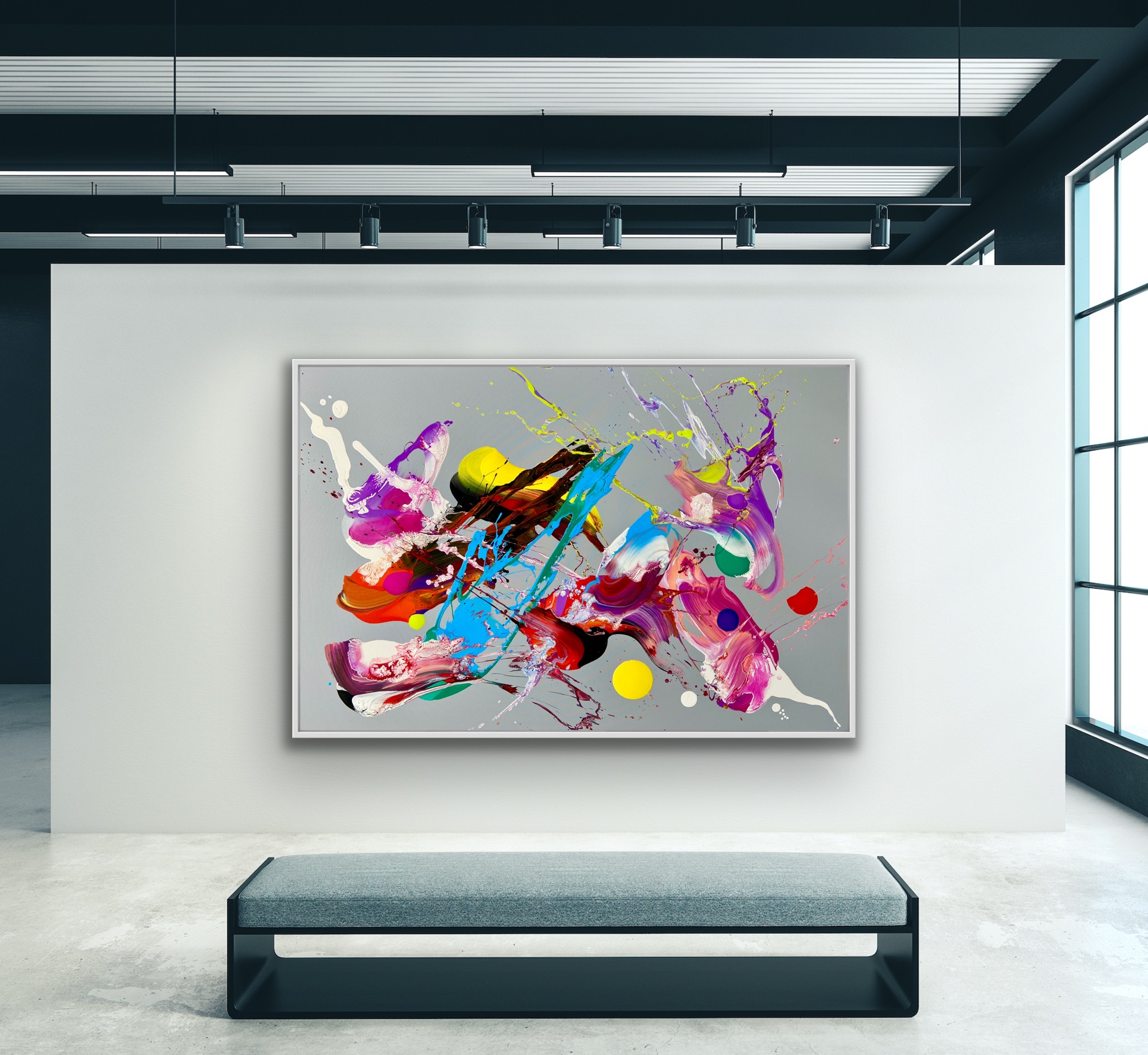 Nice focal point and extra large statement piece 175 x125cm mounted on a gallery quality white thick edge frame .
