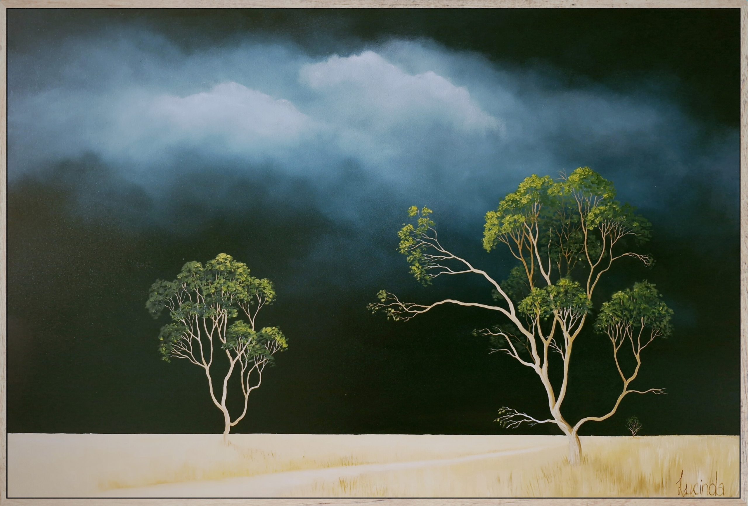 As the gaze moves downwards, it encounters the striking gum trees standing tall, stark and imposing against the arid landscape. The trunks of these ancient trees are strong and resilient, their bark rough and weathered from years of exposure to the harsh elements. Their gnarled branches stretch upwards, like twisted fingers reaching for the sky, their leaves a vibrant, yet faded, green.