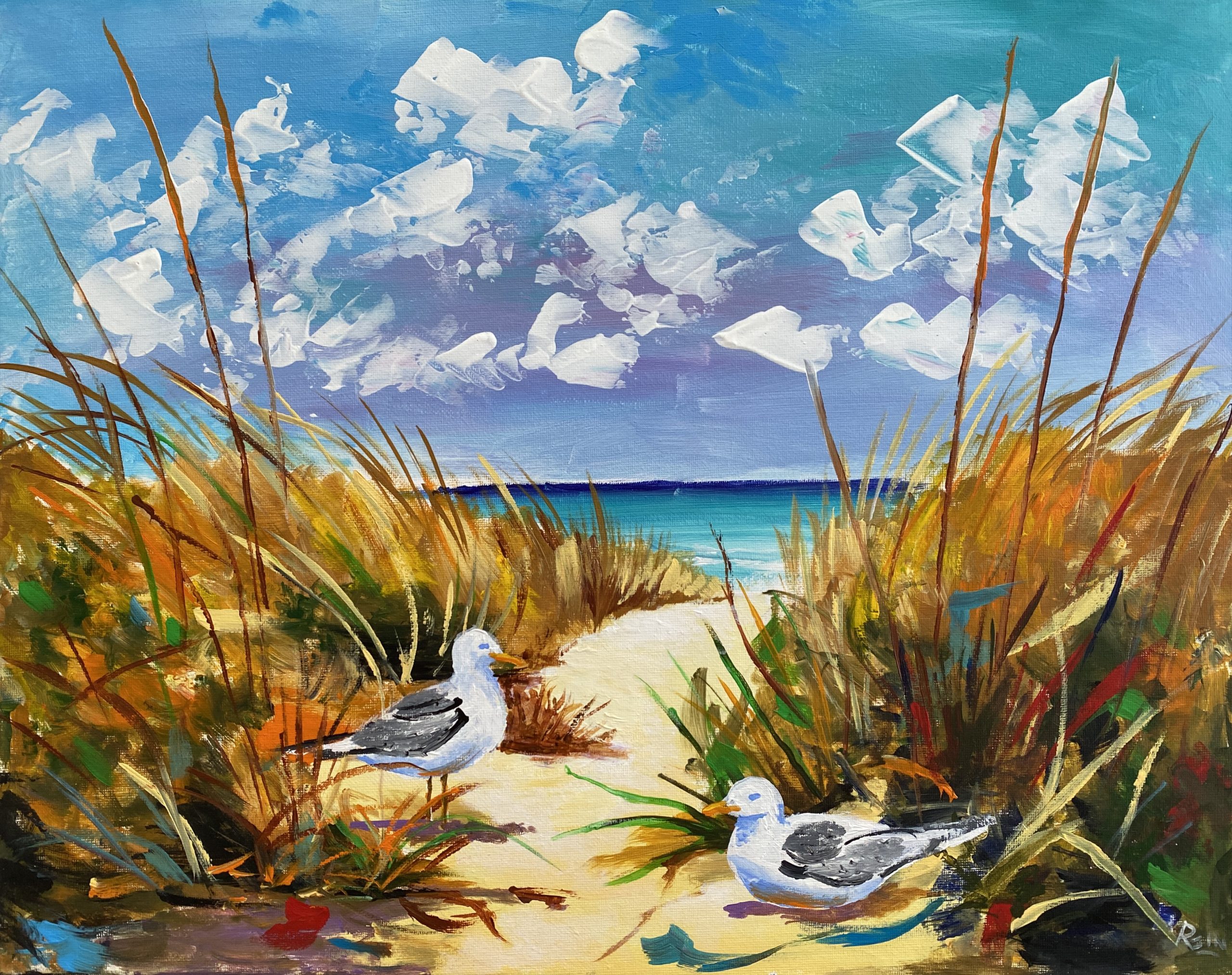 A smaller version of the large ‘In Contemplation’, The Sand Between captures a vibrant coastal scene with a sunlit path through beach grass leading to the calm, turquoise sea under a sky dotted with playful clouds. The painting evokes a sense of warmth, freedom, and peaceful escape, in which two gulls rest from the day’s activities.