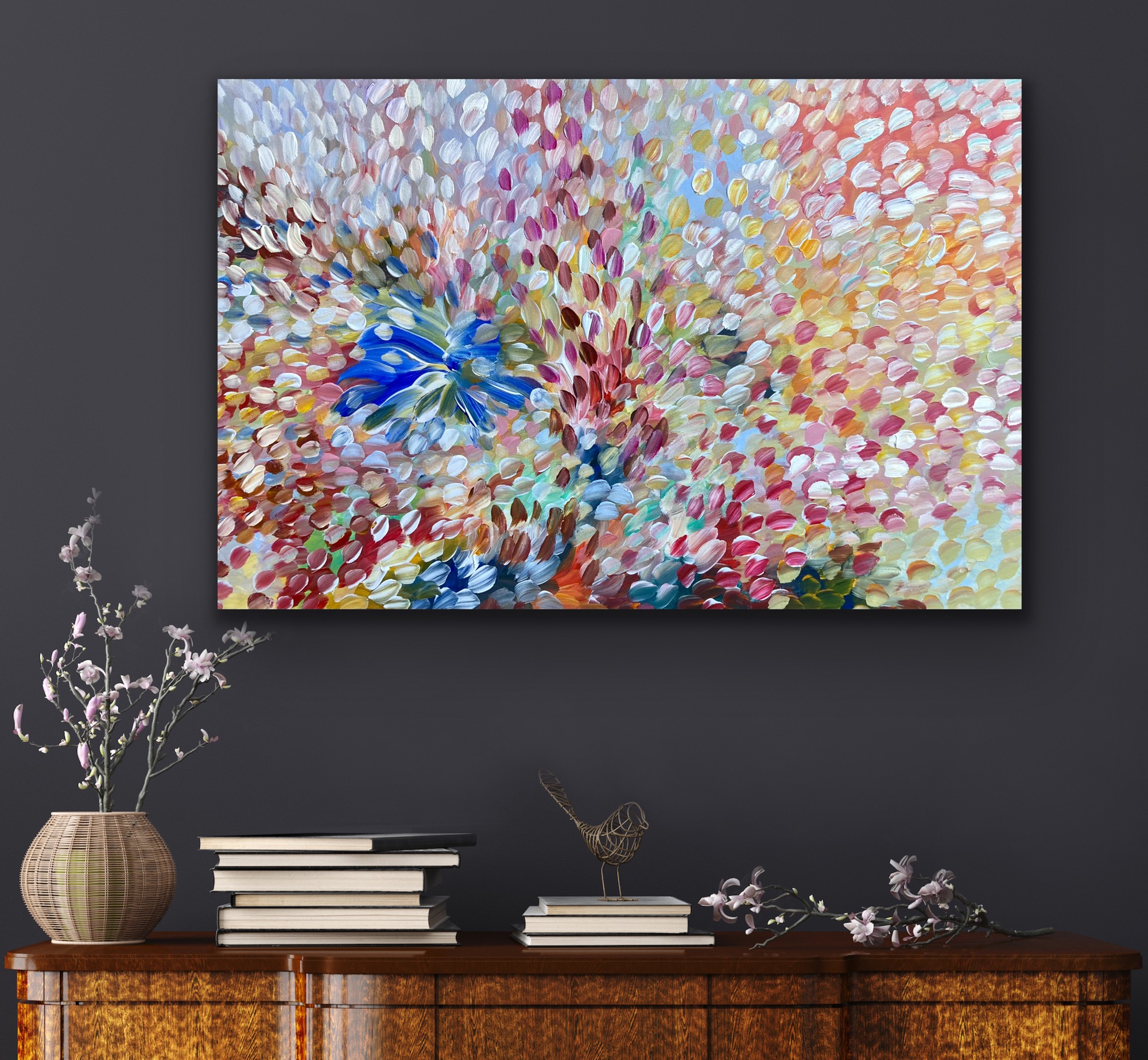 The Secret Garden by Theo Papathomas  a painting with lots of layers of rich colours like a veil of petals covering the hills. The garden  becomes a bouquet of petals dancing to their own rhythms and songs. I tried to create this beautiful composition of colours of the garden that makes it place of relaxation and meditation. Capturing the beautiful colours of the petals, foliage of the trees swept by the wind. The Garden comes to life with the sounds of the foliage falling from the flowers. The painting is signed and dated 2021 at the back and comes with a certificate of Authenticity.