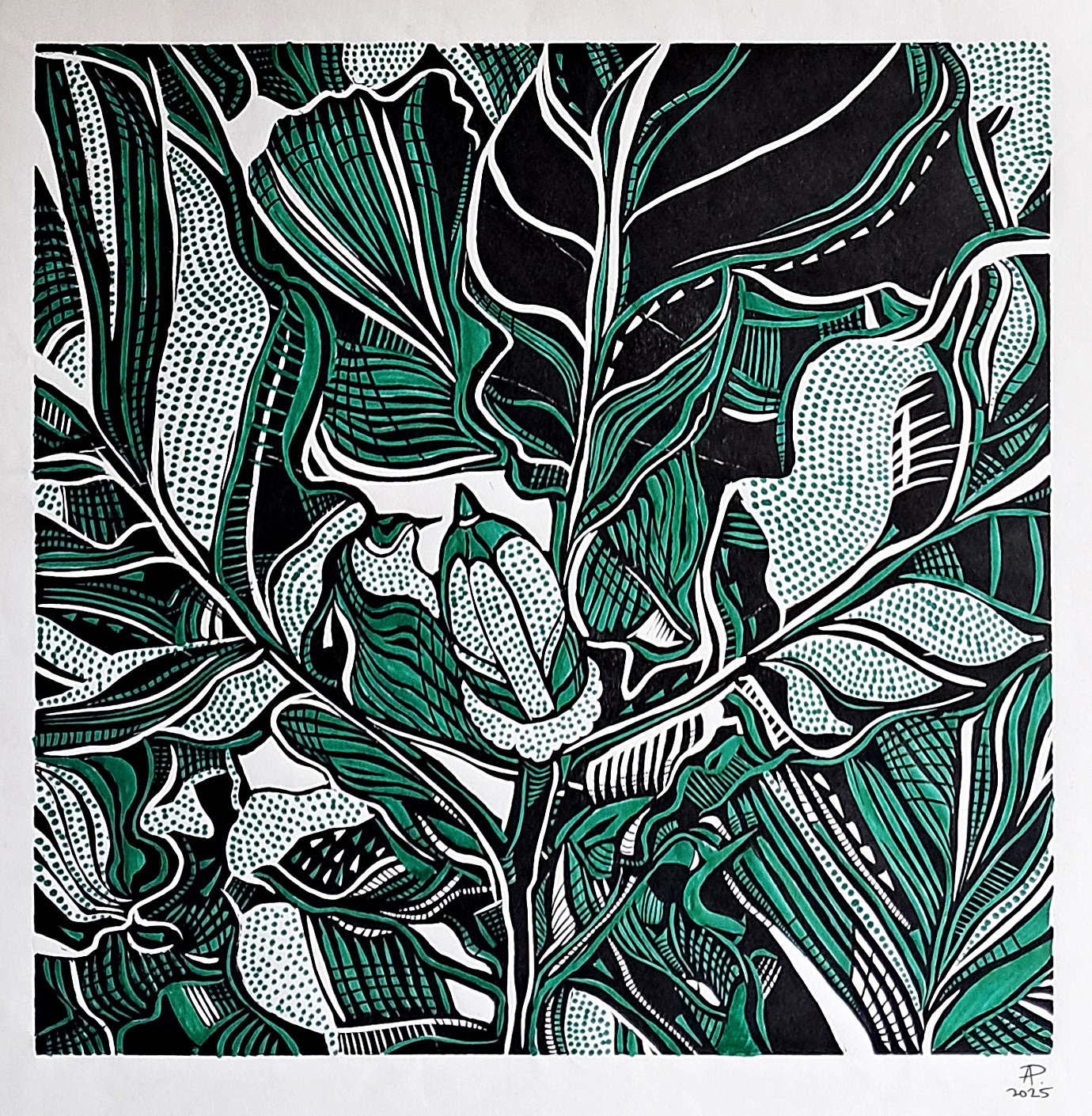 Green becomes a pulse of renewal — a single acorn emerging through carved lines and textured marks.
