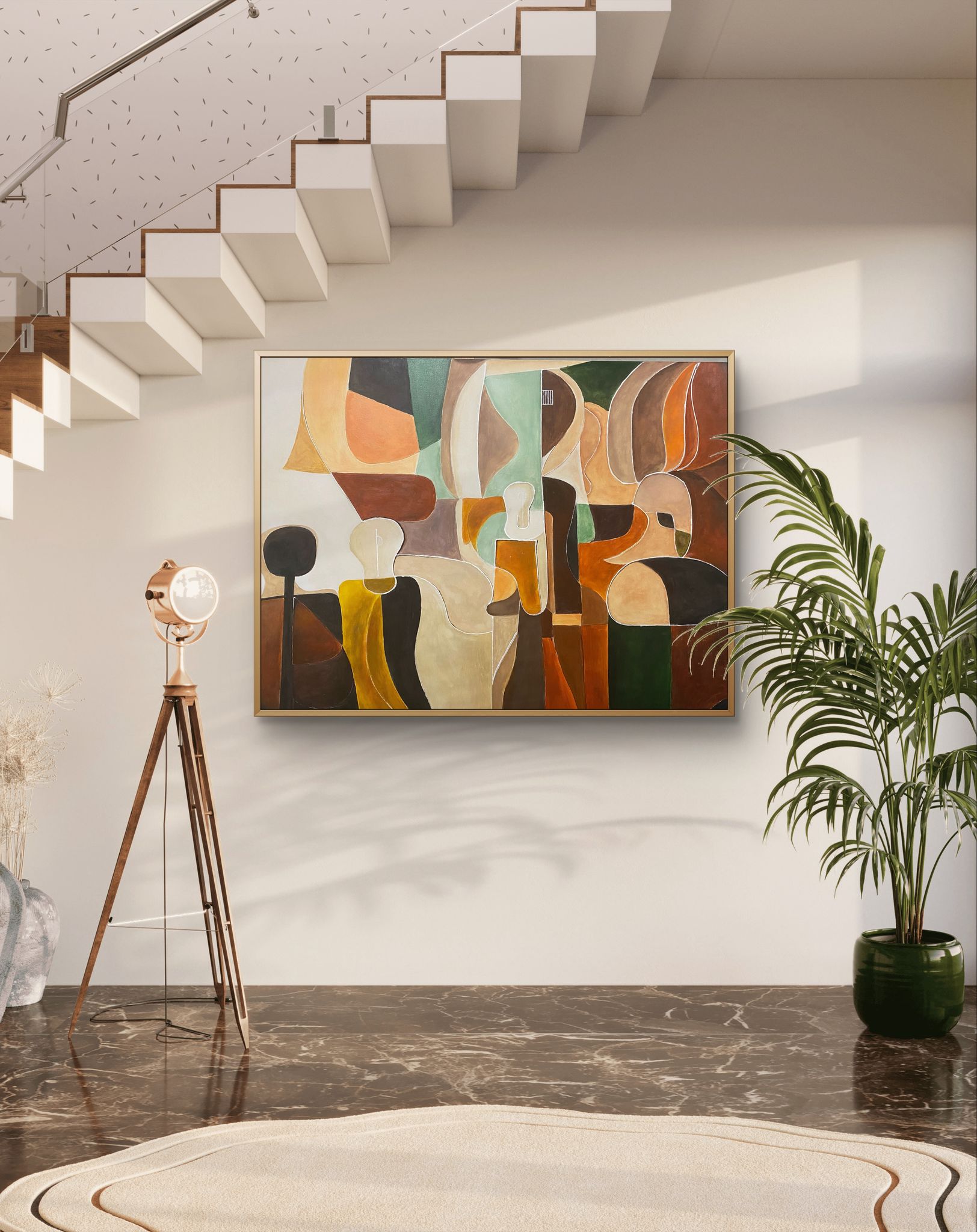 This painting is a striking abstract composition featuring a blend of organic and geometric shapes interwoven to create a dynamic visual experience. The color palette consists of earthy tones, including warm browns, deep greens, golden yellows, and soft creams, which bring a sense of harmony and balance.