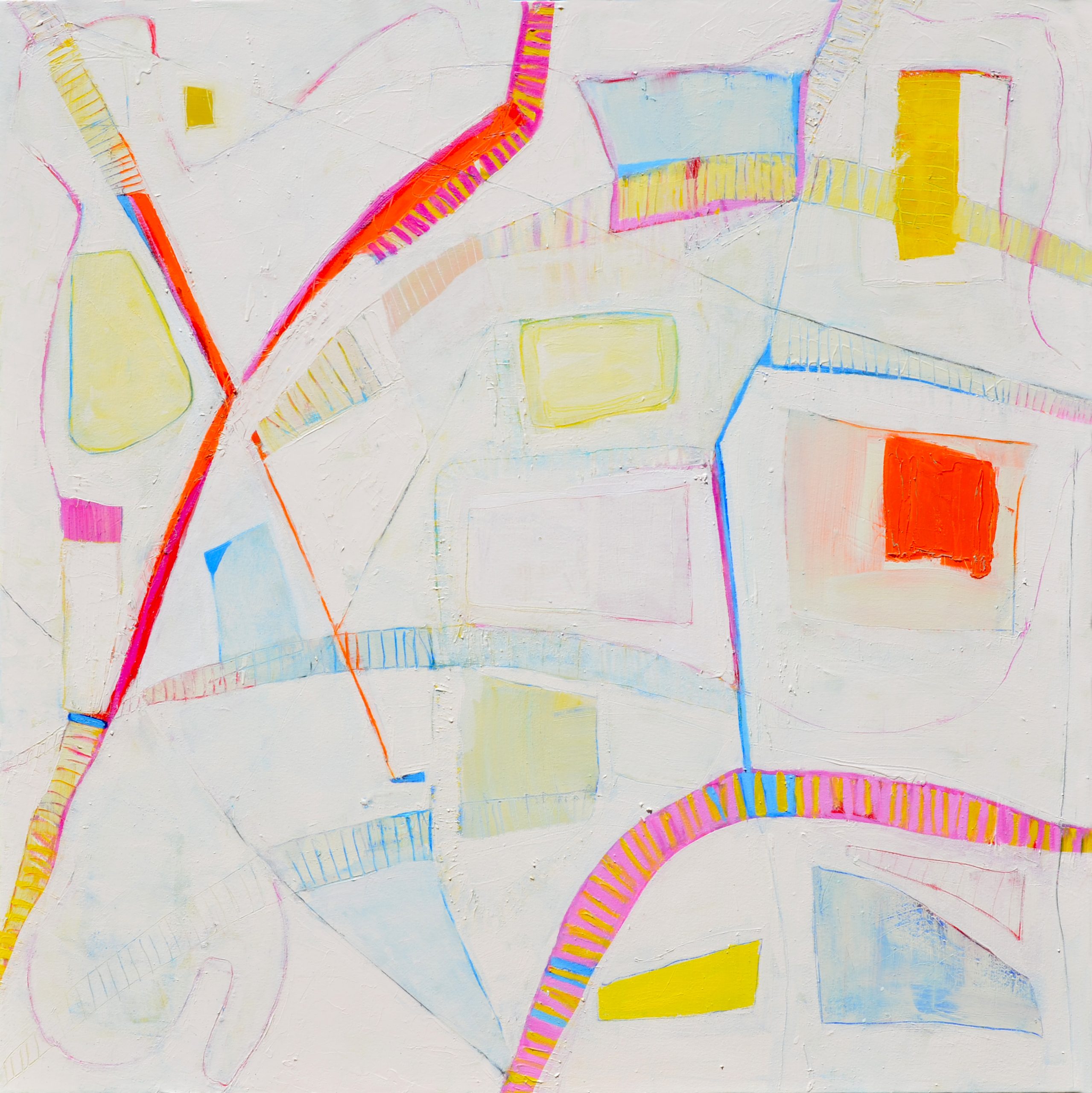 This painting is playful and imaginative suggesting an aerial view. Very modern, contemporary, large statement abstract painting that would look fantastic hanging in your home and arrives ready to hang.