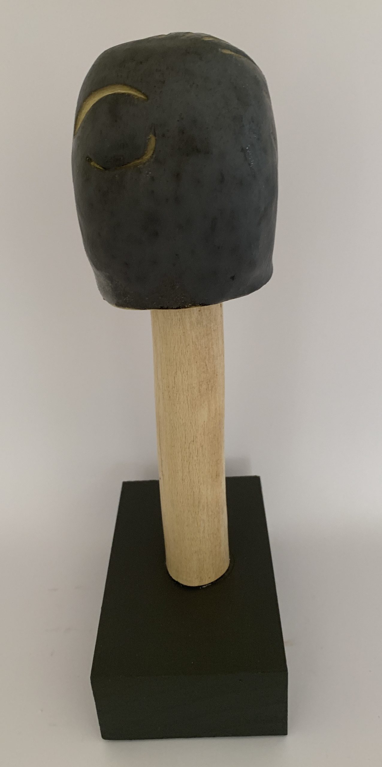 Stripped, sanded and oiled, the Silky oak wood is hard and strong, attached to hand made bases of pine in a charcoal acrylic finish, topped by moveable and removable abstract sculpted heads with a single feature, these two feature abstracted nose and eye and eyebrow on the other., Glazed in copper wash , the reverse of Silent Watchers 1 and 2, complimenting the naturalness of the silky oak – the real hero’s of these pieces in my rebellious lament of nature being stripped bare all around our urban environment and beyond. Measurements include sculptures, base and stand. The heads can be swivelled slightly up/down and sideways.