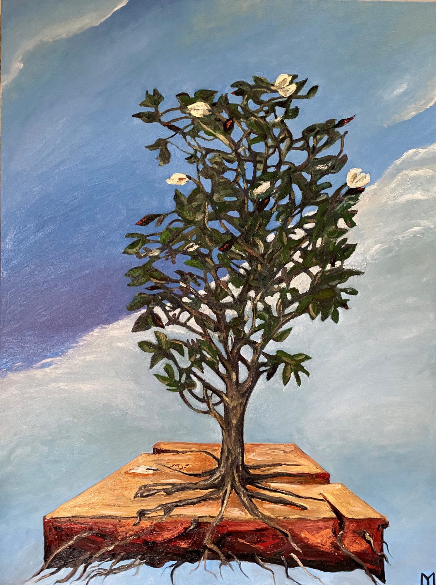 The Streets Were Paved With Gold by Mandy McGuire – My original painting is a narrative image about the importance and beauty of trees. The aged magnolia tree has its roots embedded in a block or pathway that is suspended in a changing sky.  It could be a possible future or an alternative reality. Either way, tree reminds that nature has resilience, and that even under extraordinary circumstances it can survive or even thrive. It is the golden pathway that is falling into ruin. I use quality oils painted on stretched  fine linen. My ideas come from many years of mentally collecting imagery, otherwise known as daydreaming. My trees are well known characters taken from the landscape and repositioned in a situation to help the viewer to connect on an emotional and spiritual level, and to bring attention to the vital importance of trees and their role in our ecology.