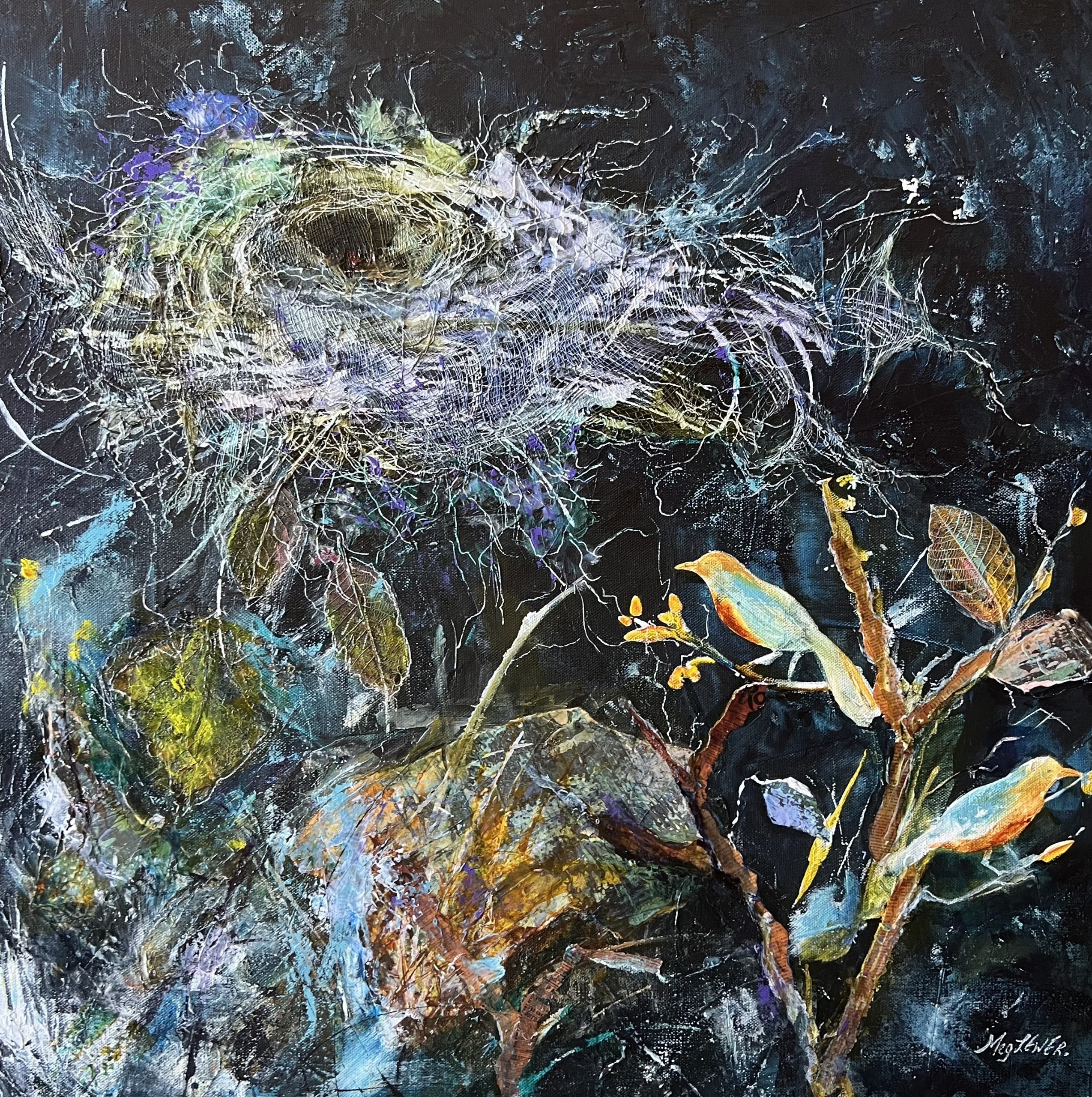 The Summer Nest by Meg Lewer – This evocative acrylic and collage painting of an intricate nest and the two birds who created it was inspired by this piece of poetry.