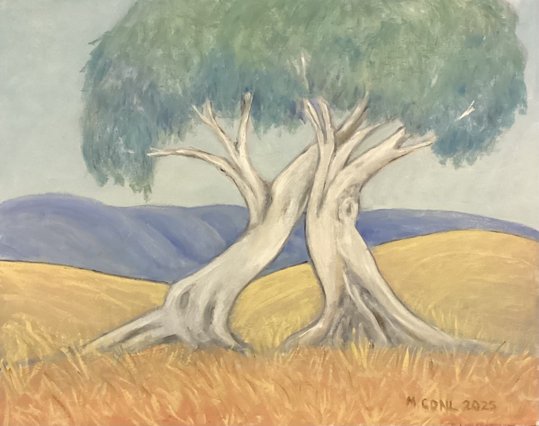 An original oil painting by Margaret Connell. This painting was inspired by Margaret’s memory of one tree hill in the Adelaide hills but she decided to paint two trees . A fine quality Luca frame was used ;a sturdy frame with canvas stretched to perfection and layers of gesso applied . Art Spectrum paint has been used and it is sealed with Langridge Matte varnish . D hooks have been applied and it is ready to hang but does not have an external frame.