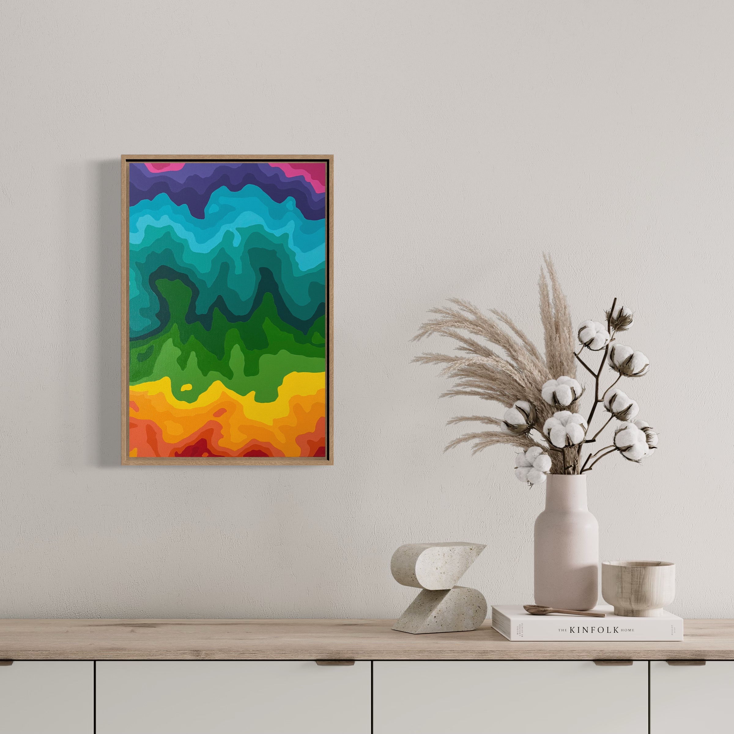 With a love of organic forms found in nature this artwork has been inspired by the vibrant colours of radar images and weather maps. The fluid organic lines capturing the movement in time and weather patterns. Encompassing an earthy feel of topographical lines and viewed from above.