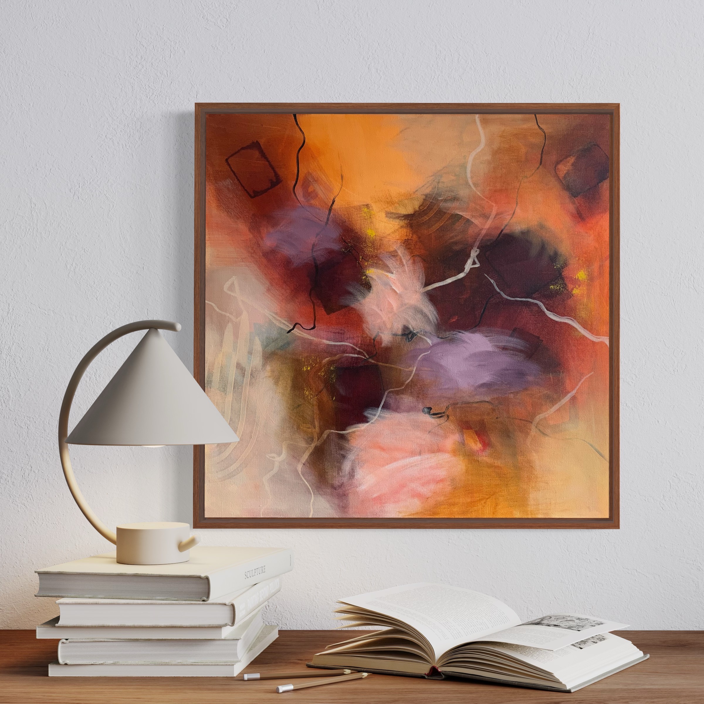 The sweetest thing No 4 by Sibylle Zinnocker – A very lose and intuitive abstract piece, created in many layers of marks and glazes. My work usually starts with the idea of a colour palette and then evolves from there quite naturally over the course of many hours and many layers.