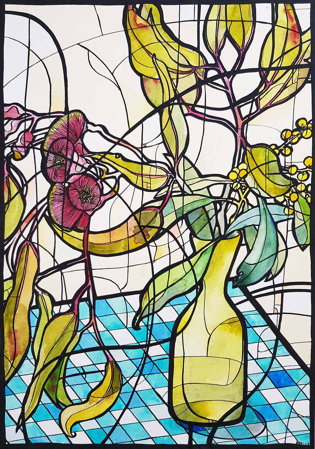 Made up of juxtaposing organic and geometric shapes, a yellow-green vase sits on a blue checked tablecloth holding a bouquet of flowering gums and wattle. The distinctive gum leaves and flowers depicted flowing up and over the vase are filled with olive and yellow greens echoing the colours of the vase while the wattle leaves reflect the blues in the tablecloth.